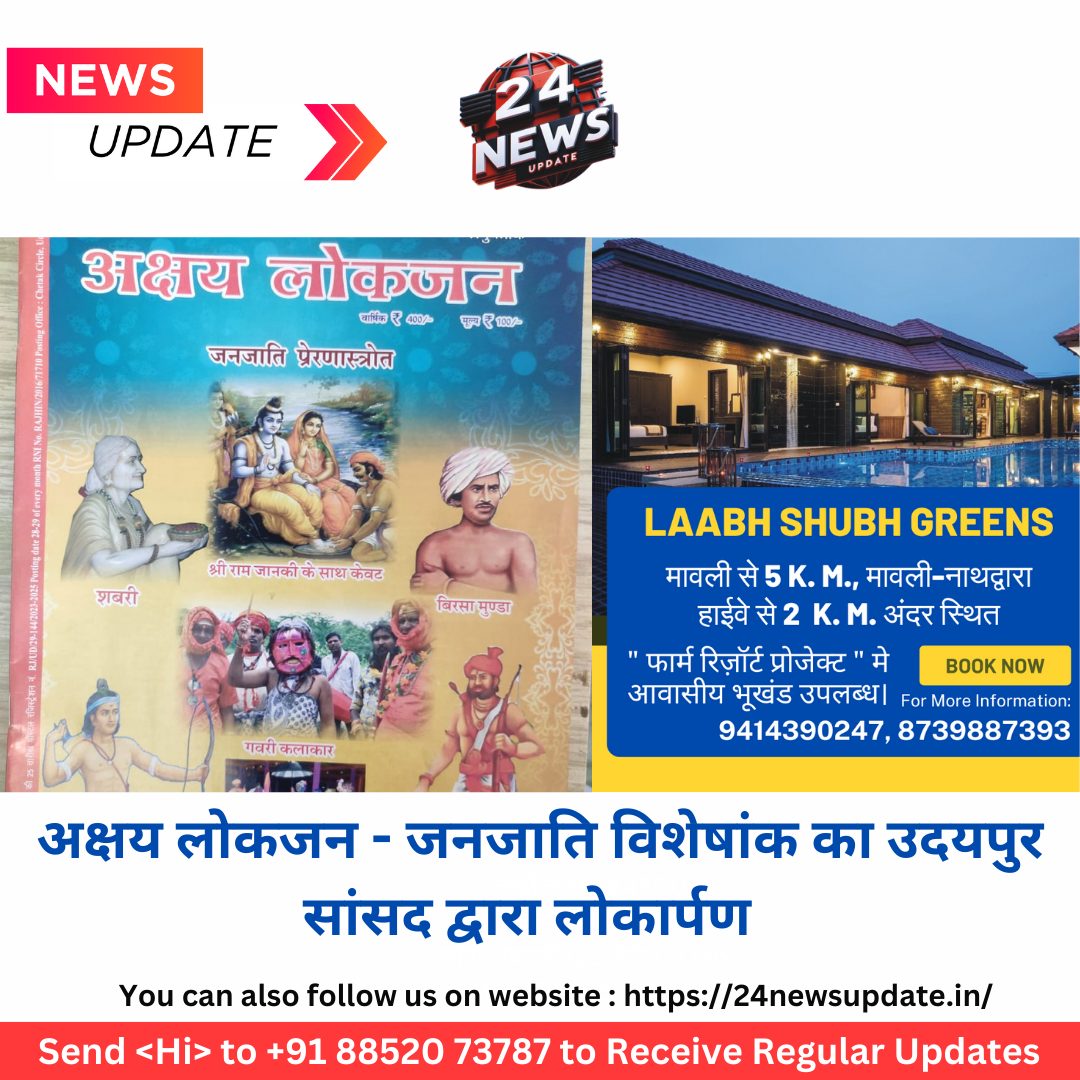 24 न्यूज़ अपडेट उदयपुर. इतिहास , कला, धर्म-संस्कृति व पर्यावरण के संवर्धन व संरक्षण को समर्पित पत्रिका “अक्षय लोकजन” (जुलाई- सितंबर 2024) के जनजाति विशेषांक का लोकार्पण उदयपुर सांसद डॉ मन्नालाल रावत के कर कमलों से हुआ। अपने संदेश मे श्री रावत ने कहा कि इस विशेषांक मे जनजातियाँ पर प्रकाशित विविध जानकारी संपूर्ण भारतीय समाज को जागरुक करने के लिये महत्वपूर्ण होगी। उन्होंने अक्षय लोकजन की पूरी टीम को बधाई व शुभकामनाएं देते हुए उत्तरोत्तर नवीन जानकारी प्रकाशित करते रहने का आह्वान किया।