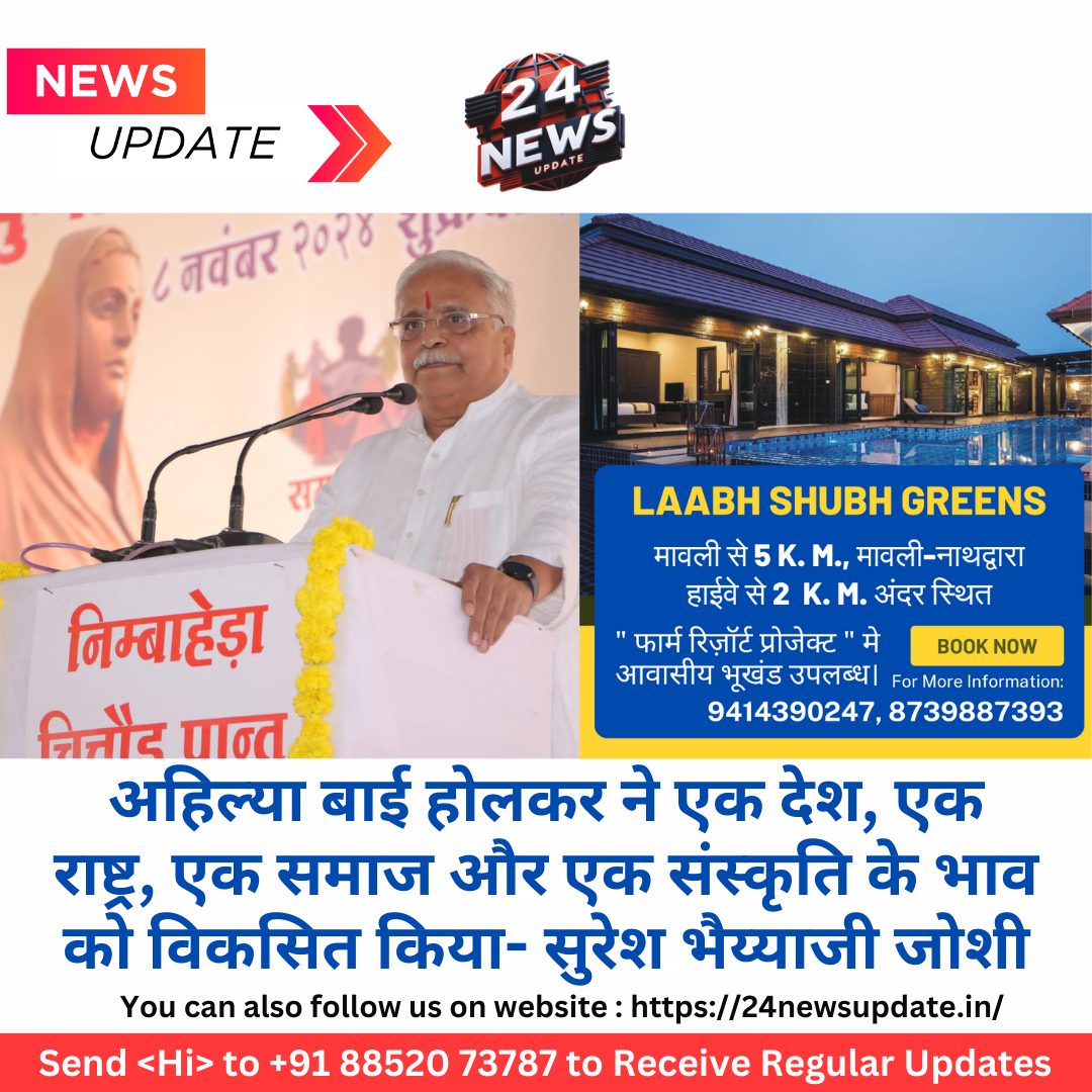 24 न्यूज़ अपडेट निंबाहेड़ा। पुण्यश्लोक देवी अहिल्या बाई होलकर मातृशक्ति सम्मेलन कृषि उपज मंडी निंबाहेड़ा में आयोजित किया गया। मातृशक्ति सम्मेलन महिला समन्वय की विभाग संयोजिका प्रियंका जैन ने बताया कि लोकमाता अहिल्याबाई होल्कर के जन्म के त्रिशताब्दी वर्ष के उपलक्ष्य में मातृशक्ति सम्मेलन महिला समन्वय चित्तौड़गढ़ विभाग के तत्वावधान में शुक्रवार को दोपहर 03.30 बजे कृषि उपज मंण्डी, निम्बाहेड़ा में आयोजित किया गया। कार्यक्रम में मुख्यवक्ता सुरेश भैय्या जोशी अखिल भारतीय कार्यकारणी सदस्य एवं पूर्व सर कार्यवाह राष्ट्रीय स्वयंसेवक संघ मुख्य वक्ता रहे, साथ ही कार्यक्रम में विशिष्ट अतिथि डॉक्टर नील प्रभा रेडियोलॉजिस्ट और कार्यक्रम की मुख्य अतिथि प्रियंका कटारा, सहायक कृषि अधिकारी रही।