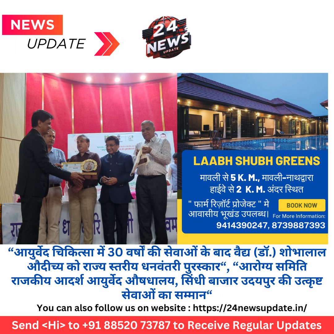 24 न्यूज अपडेट. उदयपुर। आयुर्वेद चिकित्सा क्षेत्र में समर्पित सेवाएँ देने वाले वैद्य (डॉ.) शोभालाल औदीच्य, वरिष्ठ आयुर्वेद चिकित्साधिकारी, आरोग्य समिति राजकीय आदर्श आयुर्वेद औषधालय, सिंधी बाजार उदयपुर को इस वर्ष राज्य स्तरीय धनवंतरी पुरस्कार से सम्मानित किया गया है। यह पुरस्कार उन्हें राजस्थान सरकार द्वारा धन्वंतरि जयंती एवं नवें आयुर्वेद दिवस के शुभ एवं पावन अवसर पर प्रदान किया गया।