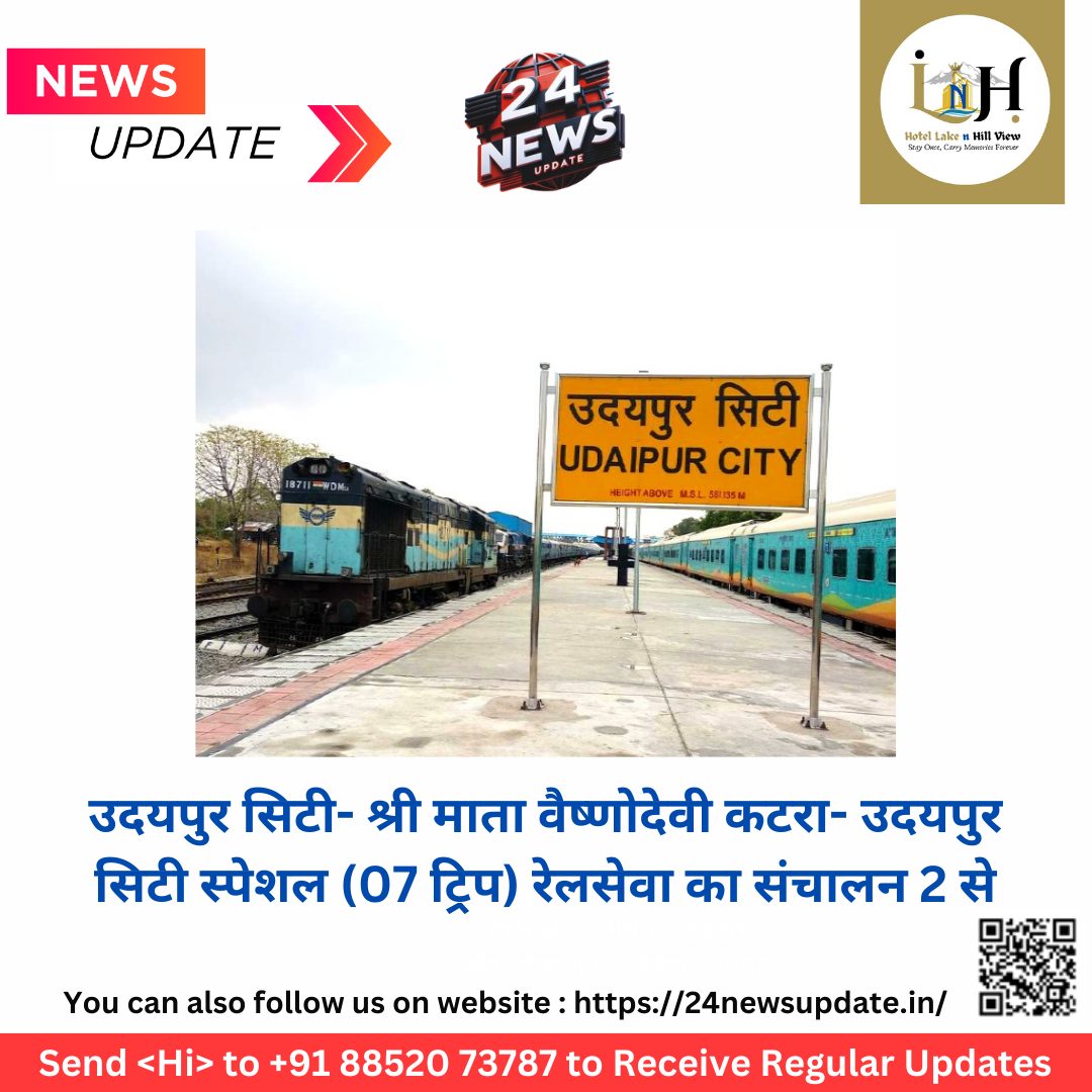 24 न्यूज अपडेट. उदयपुर। रेलवे द्वारा आगामी त्योहारों को देखते हुए यात्रियों की सुविधा हेतु उदयपुर सिटी- श्रीमातावैष्णादेवीकटरा- उदयपुर सिटी स्पेशल रेलसेवा का संचालन किया जा रहा है। उत्तर पश्चिम रेलवे के मुख्य जनसम्पर्क अधिकारी कैप्टन शशि किरण के अनुसार गाडी संख्या 09603, उदयपुर सिटी-श्रीमातावैष्णोदेवी कटरा स्पेशल रेलसेवा दिनांक 02.10.24 से 13.11.24 तक (07 ट्रिप) उदयपुर सिटी से बुधवार को 01.50 बजे रवाना होकर गुरूवार को 06.35 बजे श्रीमातावैष्णोदेवी कटरा पहुॅचेगी। इसी प्रकार गाडी संख्या 09604, श्रीमातावैष्णोदेवी कटरा – उदयपुर सिटी स्पेशल रेलसेवा दिनांक 03.10.24 से 14.11.24 तक (07 ट्रिप) श्रीमातावैष्णोदेवी कटरा से गुरूवार को 10.50 बजे रवाना होकर शुक्रवार को 13.55 बजे उदयपुर सिटी पहुॅचेगी। यह रेलसेवा मार्ग में राणाप्रतापनगर, मावली, चंदेरिया, भीलवाडा, मांडल, बिजयनगर, नसीराबाद, अजमेर, किशनगढ, फुलेरा, रींगस,