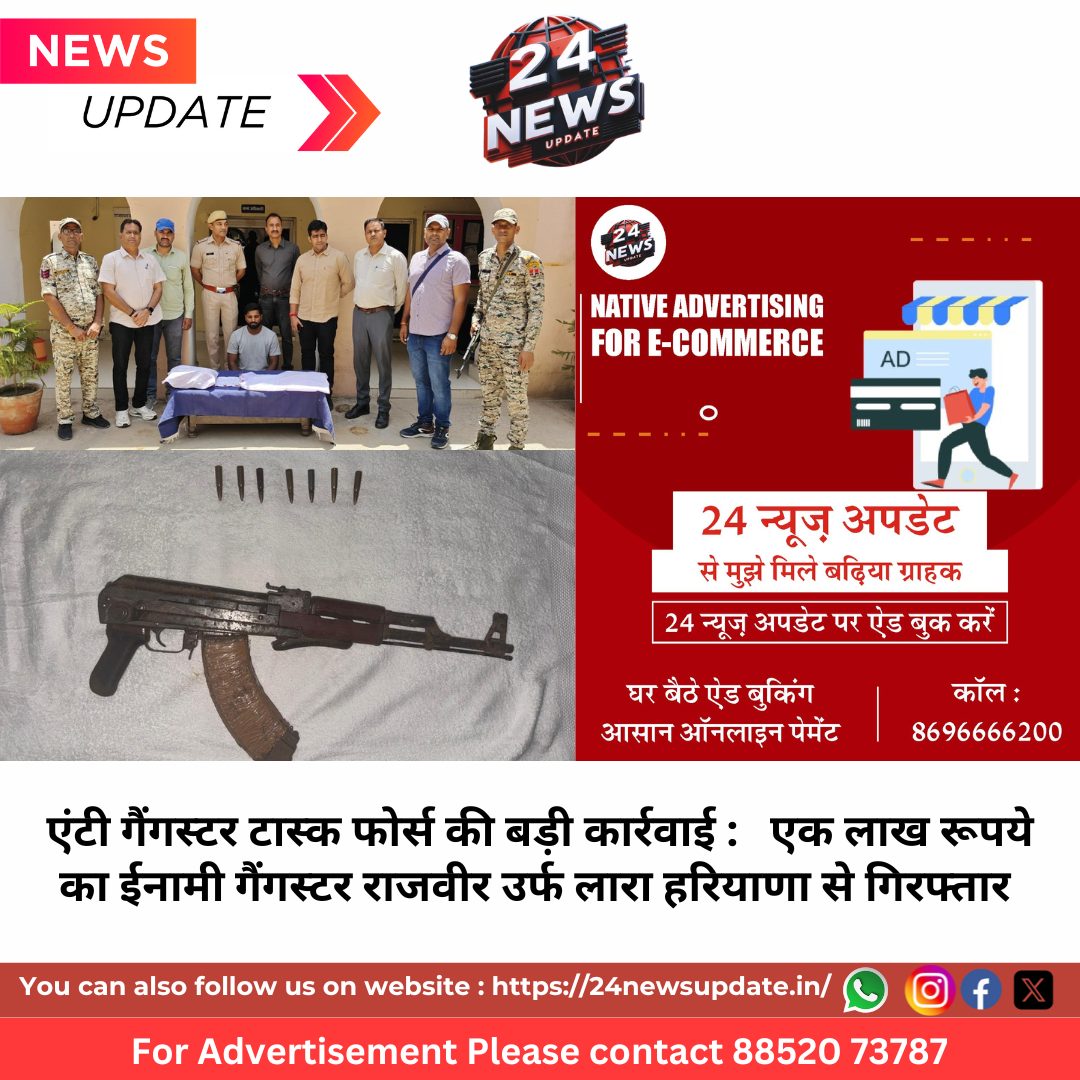 24 News Update जयपुर। जयपुर एंटी गैंगस्टर टास्क फोर्स पुलिस मुख्यालय की टीम ने बड़ी कार्रवाई कर 5 साल 8 महीने पहले थाना बहरोड पर एक-47 एवं अन्य अत्याधुनिक हथियारों से हमला कर हवालात में बंद कुख्यात गैंगस्टर विक्रम गुर्जर उर्फ पपला को भगाने के मामले में फरार चल रहे साथी गैंगस्टर राजवीर गुर्जर उर्फ लारा पुत्र रण सिंह (32) निवासी खैरोली थाना महेंद्रगढ़ हरियाणा को रेवाड़ी से गिरफ्तार कर लिया है। गैंगस्टर की गिरफ्तारी पर पुलिस मुख्यालय से 1 लाख रुपये का इनाम घोषित है।