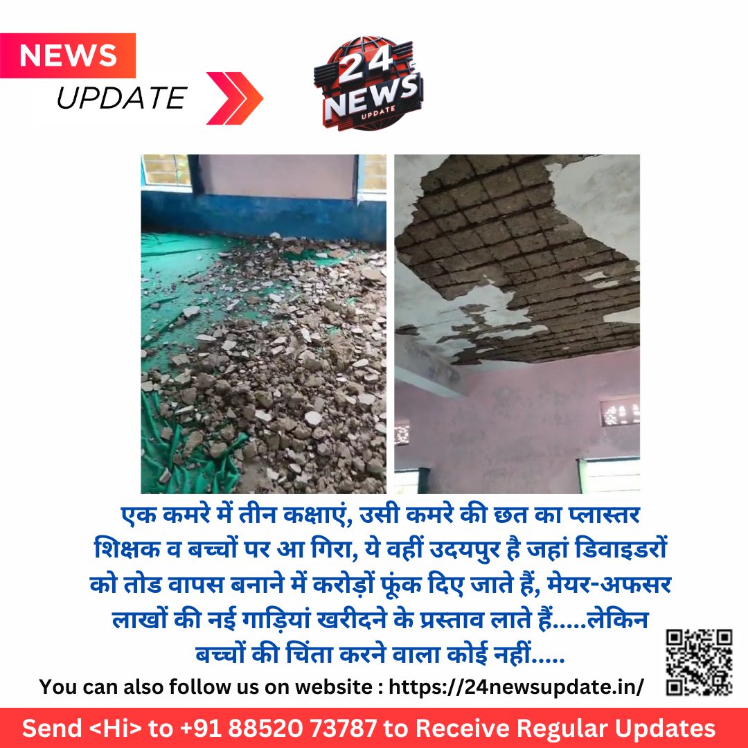 24 न्यूज अपडेट. उदयपुर। विकास का यह मॉडल बड़ा ही अजीब है। शहर के अफसर-नेता हर मौके पर बोतलबंद पानी पीते हैं और शहर के नलों में पीला मटमैला पानी आता है। शहर से कुछ ही दूरी पर प्रदूषित पानी पीने से मौतें हो जाती हैं। इसी शहर में नगर निकाय बार-बार डिवाइडर तोड कर नए बनाता है, करोड़ों फूंक दिए जाते हैं। वीआईपी विजिट पर मनचाहे अंदाज में खर्चे हो जाते हैं, रातोंरात हेलिपेड बन जाते हैं लेकिन जब बात सरकारी स्कूल की आती है तब सबको सांप सूंघ जाता है। हमारा भविष्य अंधकार में है। हमारी सबसे निचले तबके और ग्रामीण परिवेश वाली पूरी की पूरी पीढ़ी ऐसे सरकारी स्कूलों में पढ रही है जहां पता नहीं कब भ्रष्टाचार से बनी हुई स्कूल के कमरे की छत नीचे आ जाए या उसका प्लास्तर गिर जाए, कहा नहीं जा सकता। बार-बार सरकारी सर्कुलर निकलते हैं कि बारिश में ध्यान रखें, बच्चों को कच्ची छतों के नीचे नहीं बैठाएं। तो सवाल ये है कि आखिर कहां बैठाएं। जिले के कोटड़ा ब्लॉक में तो एक कमरे तीन-तीन कक्षाएं चल रही थीं, आज वहां पर छत का प्लास्टर गिर गया। घटना के समय उस कमरे में तीन कक्षाओं के विद्यार्थी पढ रहे थे। प्लास्टर गिरने से एक शारीरिक शिक्षक और एक छात्रा को चोट आई। बारहवीं तक के इस स्कूल में तीन कमरे ही बैठने लायक हैं। मामला कोटड़ा के खाम गांव में राजकीय उच्च माध्यमिक विद्यालय का है। एक क्लास में के छत का प्लास्टर एकाएक धडाम से आ गिरा। उस कक्ष में कक्षा 8वीं ,9 और 11वीं की कक्षा संचालित थीं। कमरे नहीं होने से तीनों कक्षाओं के विद्यार्थी एक ही कमरे में बैठे थे। प्लास्तर गिरते ही बच्चे पेनिक में आ गए। बाहर निकलकर भागे। कक्षा में मौजूद शारीरिक शिक्षक रामलाल गरासिया के सिर और पैर में चोट लगी तो कक्षा 9 की छात्रा दुर्गा कुमारी के पीठ पर प्लास्तर गिरा। दोनों को प्राथमिक उपचार के लिए देवला अस्पताल ले गए। लोगों का कहना है कि कल की तेज बारिश के कारण आज स्कूल में छात्र-छात्राओं की उपस्थिति संख्या कम थी। आज उस एक कक्षा कक्ष में तीन कक्षाएं थीं जिनमें 30 विद्यार्थी पढ रहे थे। आम तौर पर इन कक्षाओं के कुल 60 विद्यार्थी एक साथ बैठते हैं। कमरे कुल 6 ही हैं जिनमें से तीन कमरे बैठने लायक हैं, वैसे सबकी हालत जर्जर है। इन कमरों में स्टूडेंट और टीचर अपनी जान-जोखिम में डालकर पाठन पठन रहे हैं।
