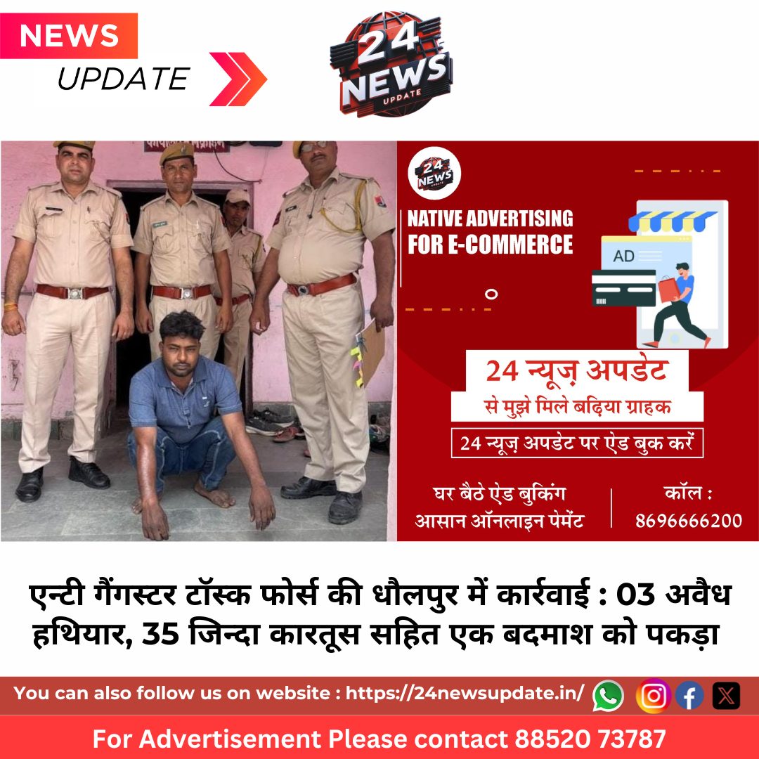 24 News Update जयपुर 9 मई। एन्टी गैंगस्टर टॉस्क फोर्स की टीम ने गुरुवार को धौलपुर जिले के थाना राजाखेडा क्षेत्र में डीएसटी टीम धौलपुर के सहयोग से बडी कार्रवाई को अंजाम देते हुए 03 अवैध हथियार एवं 35 जिन्दा कारतूस के साथ एक बदमाश माधव सिंह ठाकुर पुत्र रामदास 32 निवासी घड़ी करीलपुर थाना राजाखेड़ा को गिरफ्तार किया गया है। इसके पांच साथी बदमाश उबर खाबड़ जमीन व जंगल का फायदा उठाकर फरार हो गये, जिनकी तलाश की जा रही है।
