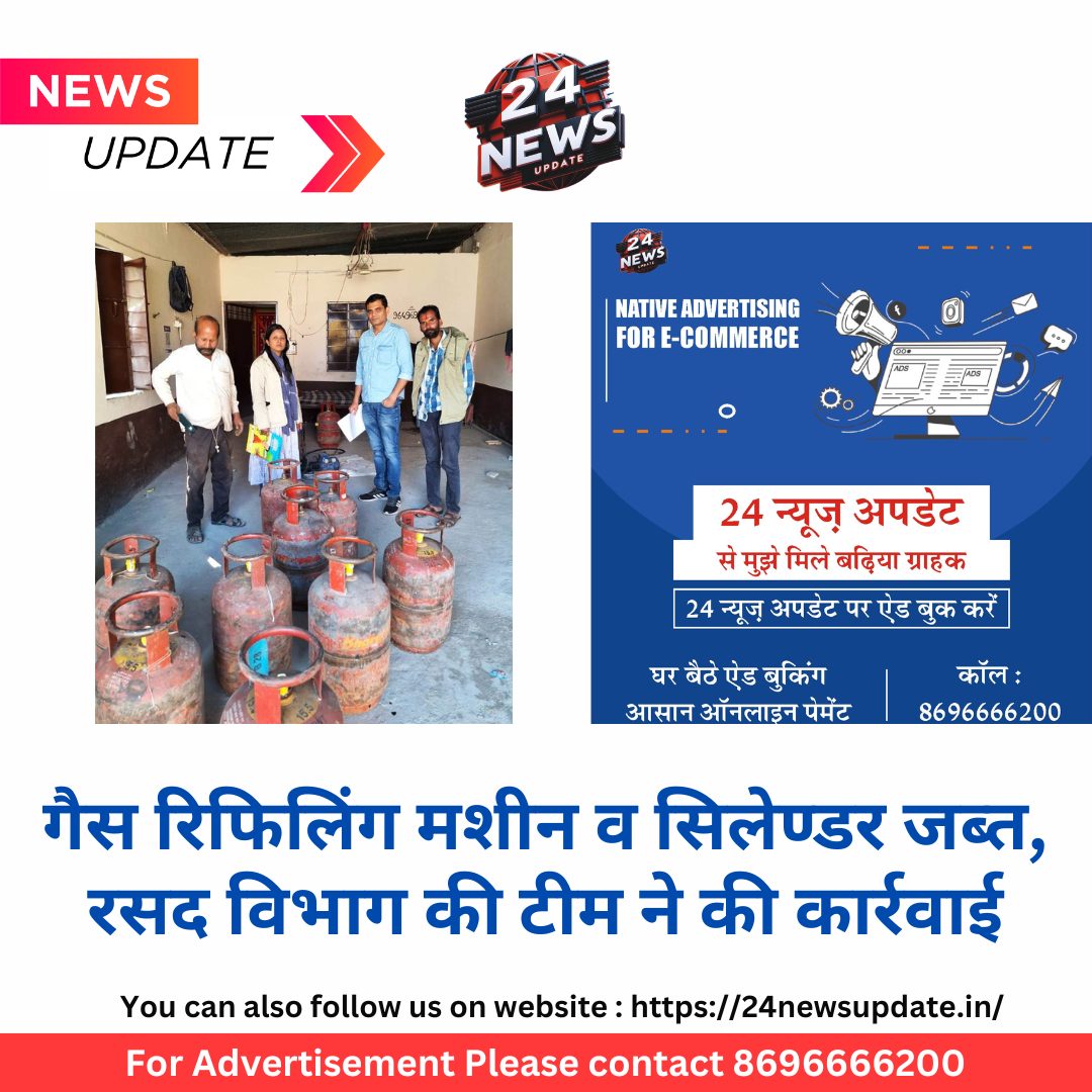 24 न्यूज अपडेट उदयपुर, 29 नवंबर। घरेलू गैस सिलेण्डर की कालाबाजारी और अवैध गैस रिफिलिंग पर अंकुश लगाने के उद्देश्य से खाद्य एवं नागरिक आपूर्ति विभाग के निर्देशों पर रसद विभाग की टीम ने उदयपुर में कार्रवाई करते हुए गैस रिफिलिंग मशीन व सिलेण्डर जब्त किए।