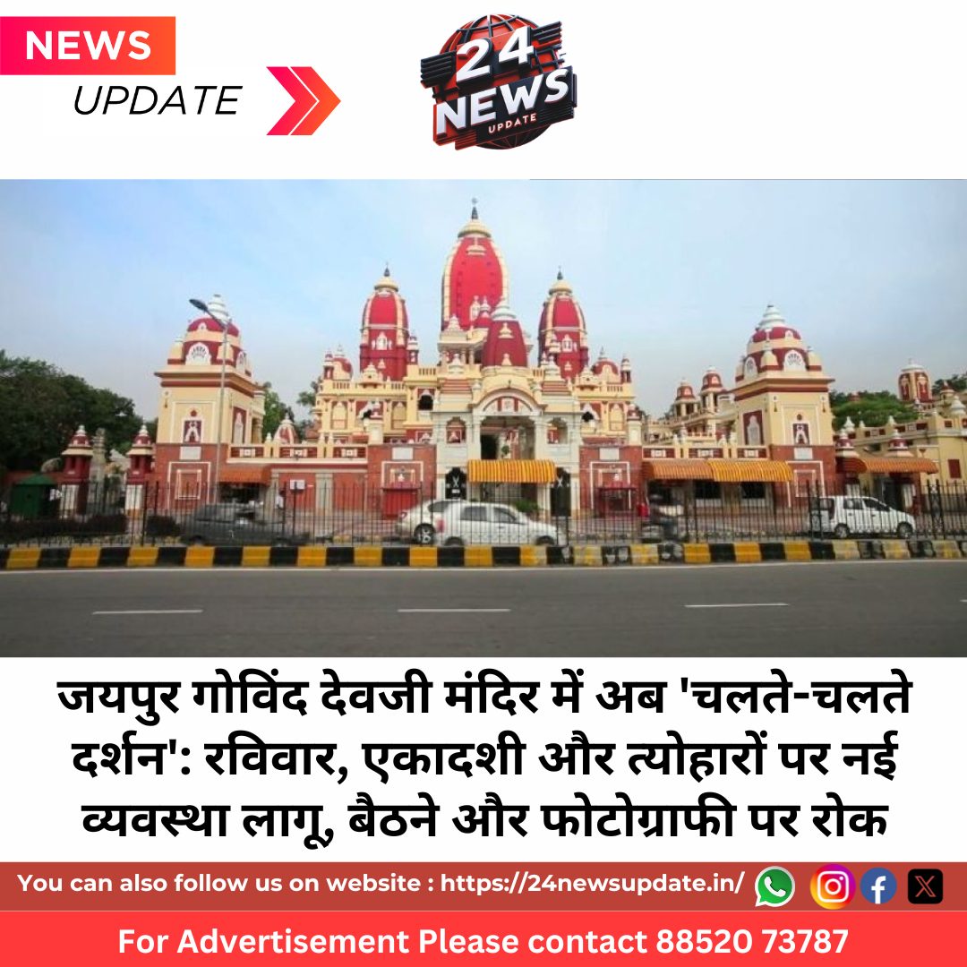 24 News Update जयपुर, 26 जून। जयपुर के ऐतिहासिक श्री गोविंद देवजी मंदिर में श्रद्धालुओं की बढ़ती भीड़ और दर्शन में लगने वाले समय को देखते हुए दर्शन व्यवस्था में बड़ा बदलाव किया गया है। अब हर रविवार, एकादशी, कार्तिक मास और प्रमुख त्योहारों पर श्रद्धालुओं को ‘चलते-चलते दर्शन’ की सुविधा मिलेगी। खाटू श्यामजी, सालासर बालाजी और सांवलिया सेठ मंदिर की तर्ज पर यह नई व्यवस्था लागू की गई है।