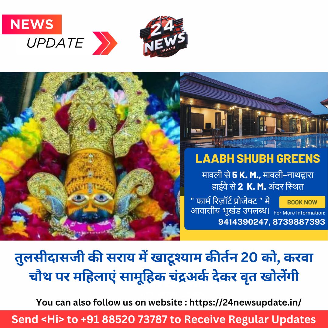 24 न्यूज अपडेट. उदयपुर। श्री श्याम सेवा ट्रस्ट के तत्वावधान मे कल रविवार 20 अक्टूबर को सायंकाल 4ः30 बजे से तुलसीदास जी की सराय, डबोक एयरपोर्ट रोड मे बन रहे श्याम मन्दिर प्रांगण मे श्री श्याम कीर्तन होगा।जिसमे भारत के सुप्रसिद्ध भजन गायक इन्दोर के सौरभ शर्मा तथा केमिता राठौड अपनी मधुर आवाज से भक्तो को भावविभोर करेंगें। दरबार श्रृंगार जयपुर के साँवरिया डेकोरेटर, संगतकार नीमच से उमेश म्यूजिकल ग्रुप को आमंत्रित किया है।पाण्डाल व्यवस्था सजावट टैन्ट तथा लाईट हरिभाई की देखरेख मे होगी। करवा चौथ होने से सभी भक्त महिलाऐ सामुहिक चान्द को अर्क देकर वृत खोल भोजन प्रसाद लेगी। सम्पूर्ण व्यवस्था ट्रस्ट की ओर से की जाएगी। लगभग 15 स्थानीय भजन गायक श्री अनिल आनन्द शर्मा, जमनाशंकर, इतिशा गोयल, योगेश सैनी, सुनन्दा चौबीसा, रजनीश मानसी शर्मा,अंजली चिराग आचार्य, पंकज भण्डारी,सरमेश राठौड, लता सोनी, प्रतीक माहेश्वरी एंव भावना शर्मा आदि भी अपनी हाजिरी लगायेंगे। भक्तो को असुविधा ना हो अतः कीर्तन जल्दी प्रारंभ कर 9बजे आरती, चान्द अर्क पश्चात सभी के लिए महाप्रसाद की व्यवस्था रहेगी।