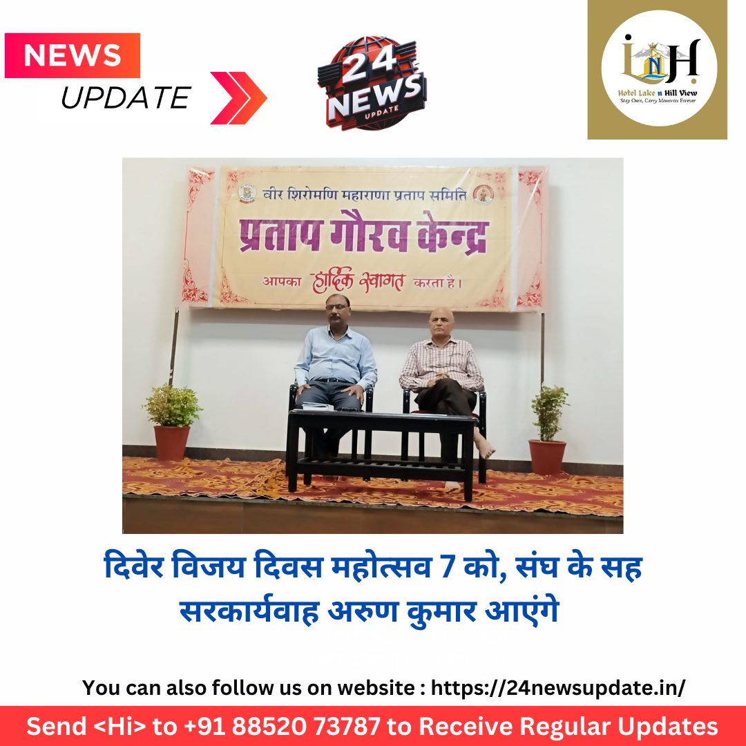 24 न्यूज अपडेट. उदयपुर। मेवाड़ के स्वतंत्रता संग्राम के इतिहास में निर्णायक युद्ध माने जाने दिवेर युद्ध के महत्व को जन-जन में पहुंचाने के उद्देश्य से प्रताप गौरव केंद्र ‘राष्ट्रीय तीर्थ’ के तत्वावधान में इस वर्ष दिवेर विजय महोत्सव वृहद स्तर पर मनाया जा रहा है। इसका मुख्य समारोह 7 अक्टूबर शाम 5.30 बजे होगा। इसमें मुख्य वक्ता राष्ट्रीय स्वयंसेवक संघ के सह सरकार्यवाह अरुण कुमार होंगे। साथ ही, बड़ी सादड़ी गोपाल आश्रम के पीठाधीश सुदर्शनाचार्य महाराज का सान्निध्य व आशीर्वचन भी प्राप्त होगा।