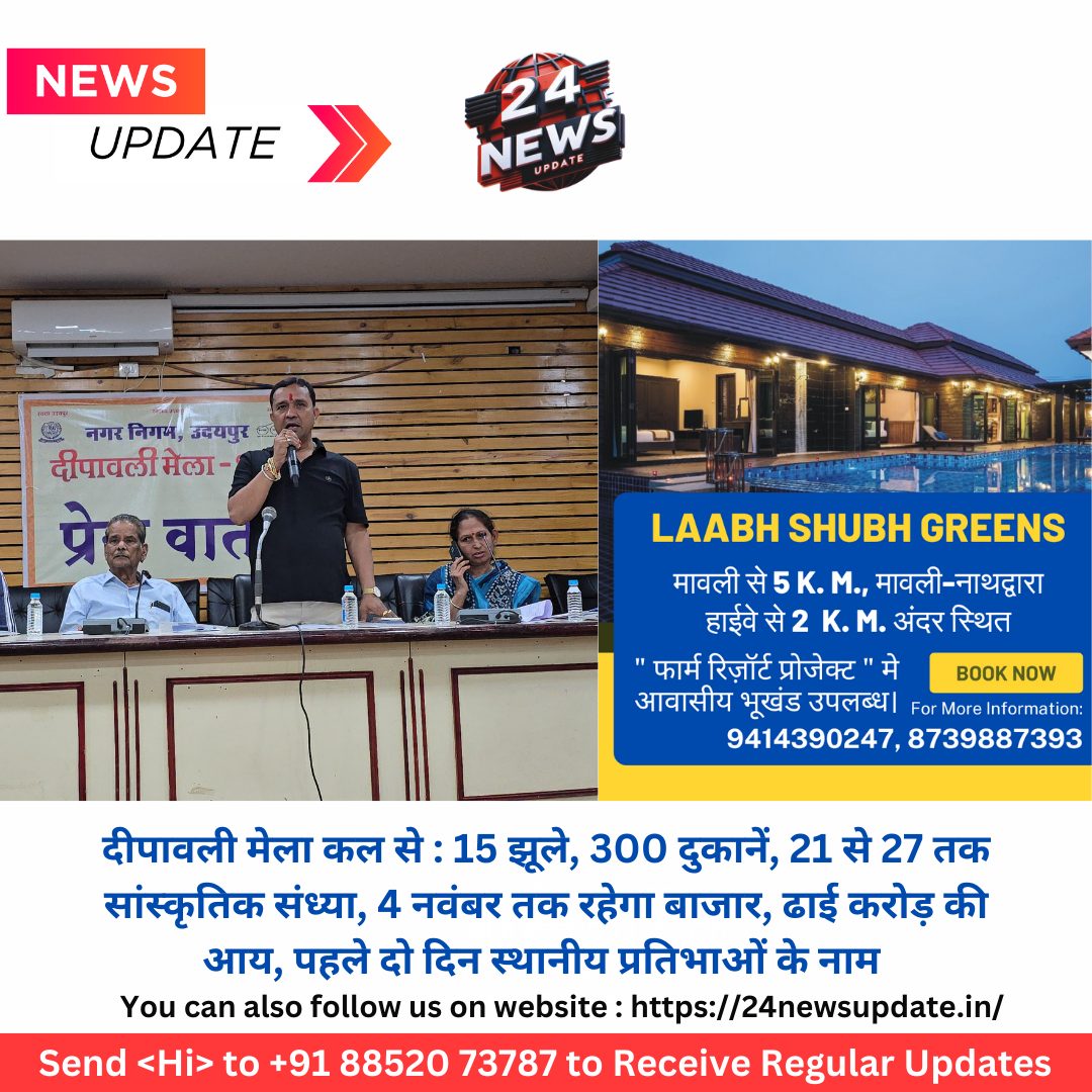 24 न्यूज अपडेट. उदयपुर। नगर निगम, उदयपुर द्वारा आयोजित दीपावली मेले का उद्घाटन 21 अक्टूबर सोमवार शाम 7.00 बजे निम्बार्क पीठ अस्थल आश्रम के मेवाड महामण्डलेश्वर रासबिहारी शरण के पावन सानिध्य के साथ ही राजस्थान सरकार के जनजाति मंत्री बाबूलाल खराड़ी, राज्य सभा सांसद चुन्नी लाल गरासिया, उदयपुर लोक सभा सांसद मन्नालाल रावत, उदयपुर शहर विधायक ताराचंद जैन, ग्रामीण विधायक फूल सिंह मीणा, समाजसेवी रवींद्र श्रीमाली, फतह सिंह राठौड़, चंद्रगुप्त सिंह चौहान के मुख्य आतिथ्य में होगा। नगर निगम सांस्कृतिक समिति अध्यक्षा चंद्रकला बोल्या ने बताया कि दीपावली मेला 2024 अन्तर्गत नगर निगम प्रांगण में दिनांक 21 अक्टूबर से 27 अक्टूबर तक प्रतिदिन सांस्कृतिक संध्या का आयोजन होगा एवं दुकानें व झूले 4 नवंबर तक संचालित रहेगें। मेला मीडिया प्रभारी छोगालाल भोई ने बताया कि सांस्कृतिक संध्या के शुरूआती 2 दिन 21 अक्टूबर व 22 अक्टूबर को स्थानीय प्रतिभा नाइट व उभरते सितारे का आयोजन किया जाएगा। 23 अक्टूबर को संगीत संध्या पर इंडियन आइडल फेम रहे पवनदीप और अरुणीता के साथ सतवंत बादशाह को बुलाया गया है। पवनदीप और अरुणीता ने अपनी गायकी के बल पर देश में अलग छाप छोड़ी है। संगीत के कई मुकाबलों में दोनों ने अपना अलग मुकाम हासिल किया है। इनके उत्कृष्ट प्रदर्शन और प्रसिद्धि को देखते हुए दीपावली मेले हेतु दोनों का चयन किया है। 24 अक्टूबर को डांस नाइट में हिंदुस्तान के प्रसिद्ध डांस ग्रुप किंग्स युनाइटेड ग्रुप का चयन किया है। यह ग्रुप देश में प्रसिद्ध डांसर के ग्रुप में सम्मिलित किया जाता है। 25 को लाफ्टर नाइट का आयोजन होगा जिसमें जाने माने लाफ्टर कलाकार केतन सिंह उदयपुर वासियों को गुदगुदाएगे। शनिवार 26 अक्टूबर को कवि सम्मेलन में जाने माने कवि शैलेश लोढ़ा, अजातशत्रु सूत्रधार एवं अन्य कविता पाठ करेंगे। सांस्कृतिक कार्यक्रमों में अंतिम दिन 27 अक्टूबर को प्रसिद्ध भजन गायक प्रकाश माली और आकृति मिश्रा द्वारा भक्तिमय प्रस्तुति दी जाएगी। इसी के साथ आमजन के मनोरजन हेतु 15 झूले एवं विभिन्न प्रकार की खाने-पीने एवं खरीदारी हेतु 300 दुकानें भी लगवाई गयी है। जनता के लिए उक्त आयोजन पूर्ण रूप से निःशुल्क रहेगा और इस आयोजन में उदयपुर शहरवासी शामिल हो आयोजन का लुफ्त उठा सकेंगे। यह आयोजन आमजन के लिए है और जनता के स्वस्थ मनोरंजन के लिए आयोजित किया गया । नगर निगम राजस्व समिति अध्यक्ष अरविंद जारोली ने बताया कि ने बताया कि मेले में दुकानें व झूले लगाने से निगम को कुल 2,50,00,000/- रूपये की आय हुई है। समिति अध्यक्ष चंद्रकला बोल्या ने बताया कि दीपावली मेले के व्यवस्थित आयोजन हेतु कुल 18 समितियां बनाई गई है। जिसमें प्रशासनिक समिति अध्यक्ष महापौर गोविंद सिंह 