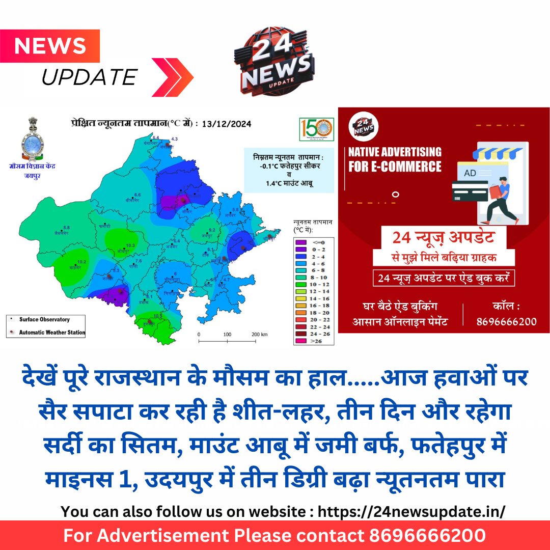 24 न्यूज अपडेट.उदयपुर। शीत लहर का दौर आज तेज हवाओं के साथ लगातार तीसरे दिन भी पूरे राजस्थान में जारी है। आज 8 जिलों में येलो अलर्ट जारी किया गया है। राज्य में मौसम मुख्यतः शुष्क है। मौसम विभाग कह रहा है कि राज्य में एक दो स्थानों पर अतिशीत लहर व कहीं कहीं शीत लहर दर्ज की गई । राज्य में सर्वाधिक अधिकतम तापमान बाड़मेर में 27.1 डिग्री सेल्सियस दर्ज किया गया तथा निम्नतम न्यूनतम तापमान -0.1 डिग्री सेल्सियस फतेहपुर सीकर में दर्ज किया गया। सीकर और चूरू, माउंट आबू सहित कई जिलों में खुले में रखे बर्तनों में पानी जम गया, कारों पर बर्फ की बूंदें देख कर लोग रोमांचित हो गए। जैसलमेर, बीकानेर में भी रात के साथ-साथ दिन में सर्दी तेज हो गई। यहां अधिकतम तापमान 25 डिग्री सेल्सियस से भी नीचे दर्ज हुआ राज्य में अगले दो दिन और कड़ाके की सर्दी पड़ेगी। 15 दिसंबर के बाद शीतलहर से राहत मिलेगी और तापमान बढ़ेगा। 15 दिसंबर से हवा की दिशा में थोड़ा बदलाव होगा। इधर, माउंट आबू में हालांकि पारा 1.4 डिग्री सेल्सियस बताया जा रहा है मगर कई इलाकों में पारा जमाव बिंदु के भी 3 से 4 डिग्री सेल्सियस नीचे चला गया है व बर्फ जम रही है।