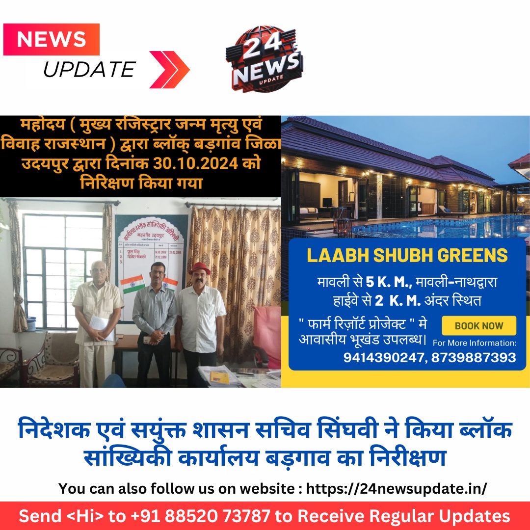 24 न्यूज अपडेट. उदयपुर। विनेश सिंघवी निदेशक एवं सयुंक्त शासन सचिव ( रजिस्ट्रार जन्म, मृत्यु एवं विवाह राजस्थान जयपुर ) की ओर से ब्लॉक सांख्यिकी कार्यालय बड़गाव उदयपुर का निरीक्षण किया गया। इस अवसर पर ंविभागीय योजनाओं की समीक्षा की गयी। जन्म, मृत्यु एवं विवाह पंजीकरण, जन आधार, संस्था आधार, इ ग्राम प्रगति, स्थानीय निकाय लेखे, कृषि सांख्यिकी ( फसल कटाई प्रयोग ) विभागीय सांख्यिकी प्रकाशन की स्थति, जन मृत्यु ट्रेनिंग की स्थिति, जन आधार हेल्प डेस्क की स्थति और विभागीय योजनाओं पर विस्तारपूर्वक चर्चा की गई। ब्लॉक बडगांव की प्रगति शत प्रतिशत होने पर धन्यवाद दिया। महावीर प्रसाद सयुक्त निदेशक उदयपुर और ब्लॉक सांख्यिकी अधिकारी दिनेश श्रीमाली उपस्थित रहे।