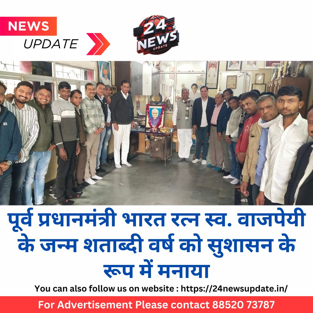 24 न्यूज़ अपडेट निम्बाहेड़ा। देश के पूर्व प्रधानमंत्री एवं भारत रत्न से सम्मानित स्व. श्री अटल बिहारी वाजपेयी के जन्म शताब्दी वर्ष के अवसर पर बुधवार को उनकी जयंती पर स्थानीय भारतीय जनता पार्टी कार्यालय पर पूर्व स्वायत्त शासन मंत्री एवं विधायक श्रीचंद कृपलानी के नेतृत्व एवं पूर्व विधायक अशोक नवलखा व नगर मण्डल अध्यक्ष नितिन चतुर्वेदी की उपस्थिति में भाजपा पदाधिकारियों व कार्यकर्ताओं ने स्व. वाजपेयी जी के चित्र पर माल्यार्पण कर पुष्पांजलि अर्पित कर याद किया।