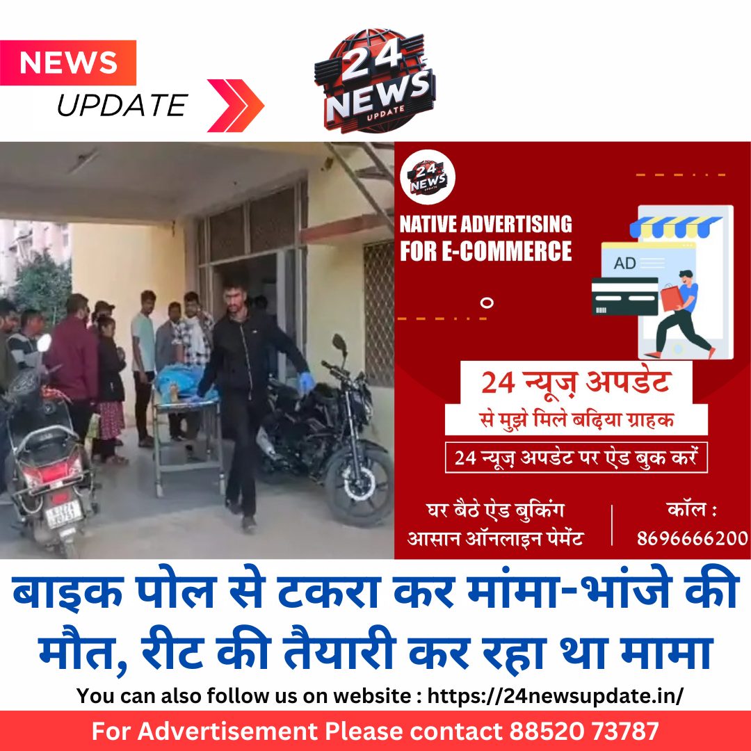 24 न्यूज अपडेट. डूंगरपुर। डूंगरपुर में बाइक अनियंत्रित होकर पोल से टकरा गई जिसमें मामा-भांजे की मौके पर ही दर्दनाक मौत हो गई। एक अन्य गंभीर घायल युवक को जिला अस्पताल में भर्ती कराया गया है। हादसा सोमवार को चौरासी थाना क्षेत्र के झोंथरी गांव के पास हुआ।युवक की रीट की तैयारी कर रहा था। भांजा छुट्टियां मनाने ननिहाल आया था। झोंथरी के आगे मोड पर ़हादसा हुआ। तीनों युवकों को एम्बुलेंस से जिला अस्पताल लाया गया, जहां डॉक्टर्स ने गुजरात के सायरा निवासी भव्य सुवेरा (16) और उसके मामा मड़कोला निवासी चिराग परमार को मृत घोषित कर दिया। घायल युवक डोल कुंजेला निवासी रवि पुत्र महिपाल है उसकी हालत गंभीर है। मृतक मामा-भांजे के शवों को मॉर्च्युरी में रखवाया है। पोस्टमॉर्टम मंगलवार सुबह होगा। मृतक भव्य छुट्टियां होने से अपने मामा के गांव आया हुआ था और दोनों किसी काम से बाइक लेकर निकले और घर से कुछ ही दूर दोनों की सड़क हादसे में मौत हो गई।