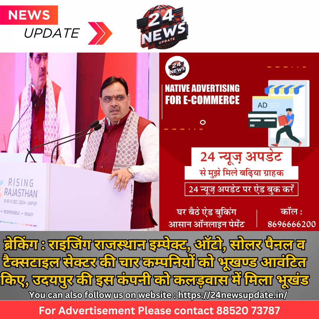 24 न्यूज अपडेट. जयपुर। मुख्यमंत्री भजनलाल शर्मा के नेतृत्व में राइजिंग राजस्थान ग्लोबल इनवेस्टमेंट समिट-2024 में निष्पादित किए गए एमओयू एक के बाद एक धरातल पर उतर रहे हैं। रीको द्वारा चार और प्रमुख कम्पनियों मेक्सोप इंजीनियरिंग कम्पनी लिमिटेड, रॉकमेन इंडस्ट्रीज लिमिटेड, लाइटपाथ वेंचर्स प्राइवेट लिमिटेड और सन पॉलिटेक्स प्राइवेट लिमिटेड को औद्योगिक इकाई लगाने के लिए भूखण्ड आवंटित कर दिए गए हैं। इनमें मेक्सोप इंजीनियरिंग कम्पनी लिमिटेड को भिवाड़ी जिले के कारोली औद्योगिक क्षेत्र, रॉकमेन इंडस्ट्रीज लिमिटेड को सलारपुर औद्योगिक क्षेत्र (भिवाड़ी), लाइटपाथ वेंचर्स प्राइवेट लिमिटेड को भीलवाड़ा जिले के उखलिया औद्योगिक क्षेत्र एवं सन पॉलिटेक्स प्राइवेट लिमिटेड को कलड़वास औद्योगिक क्षेत्र (उदयपुर) में भूमि उपलब्ध करवाई गई है।