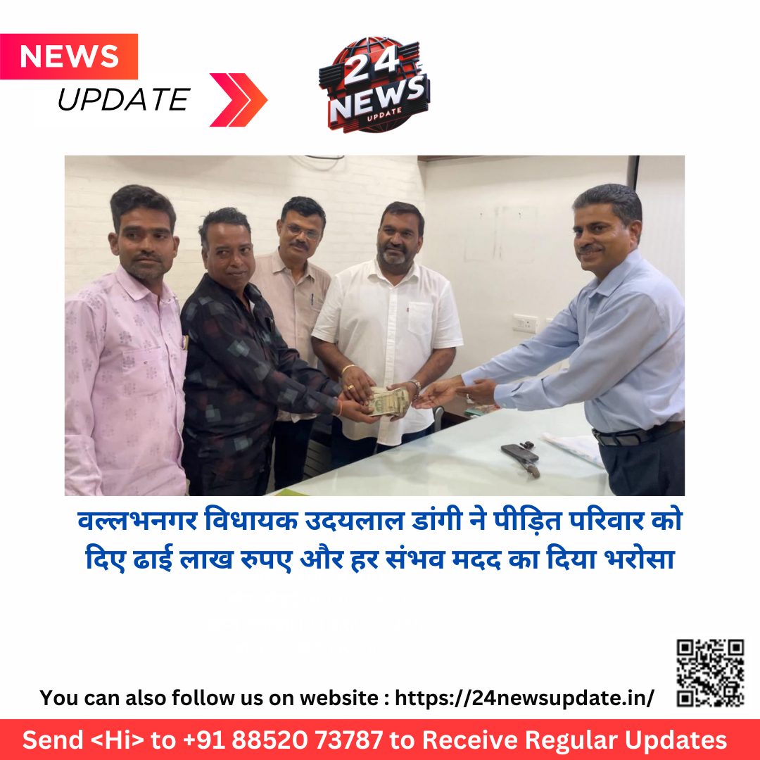 रविवार को पीड़ित युवक सुरेश के परिजन वल्लभनगर विधायक उदयलाल डांगी के डबोक स्थित कार्यालय पर मिले, और विधायक उदयलाल डांगी ने रियाद में फंसे विधानसभा क्षेत्र के युवक और उसके परिवार के प्रति मानवीय संवेदना प्रकट की और तत्काल ढाई लाख रुपए की आर्थिक सहायता पीड़ित परिवार को दी और भरोसा दिलाया कि शीघ्र ही सुरेश की वतन वापसी होगी।आवश्यकता पड़ी तो पुनः विदेश मंत्रालय और दूतावास बात करेंगे ,पीड़ित परिवार को विधायक उदयलाल डांगी द्वारा दी गई ,आर्थिक सहायता के दौरान भाजपा मंडल अध्यक्ष व समाजसेवी देवीलाल सालवी व पासपोर्ट सेवा के पूर्व प्रभारी एल डी शर्मा भी उपस्थित रहे,