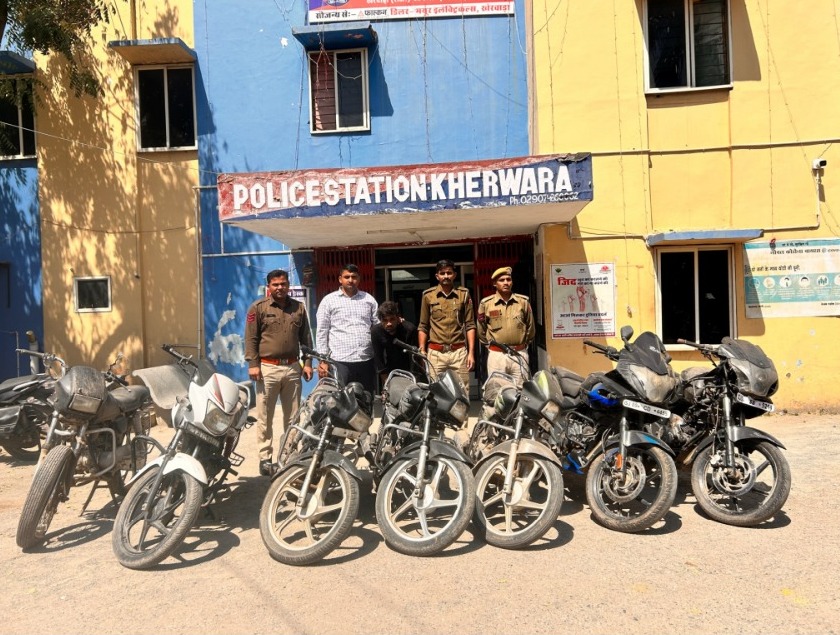 उदयपुर। जिला पुलिस अधीक्षकयोगेश गोयल के निर्देशानुसार अतिरिक्त पुलिस अधीक्षक खेरवाडा अंजना सुखवाल एंव वृत्ताधिकारी वृत्त ऋषभदेव हेरम्ब जोशी के पर्यवेक्षण में थानाधिकारी खेरवाडा दिलीप सिंह झाला के नेत्तृव में गठित टीम ने बंजारिया से बाईक चोरी कके मामले में त्वरित कार्यवाही करते हुये चोरी का खुलासा किया। टीम ने एक शातिर आरोपी को गिरफतार कर, अभियुक्त के कब्जे से चुराई गयी कुल 7 मोटर साईकिल बरामद की हैं। पुलिस के अनुसार 3 मार्च को जितेन्द्र पुत्र राधेश्याम योगी ने रिपोर्ट दी कि उनकी मोटर साइकिल चोरी हो गई। कोई अज्ञात बदमाश चुराकर ले गया। इस मामले में थानाधिकारी दिलीप सिंह झाला की ओर से एक विशेष टीम का गठन किया गया। सम्पत्ति संबंधी अपराधो के खिलाफ चलाए जा रहे विशेष अभियान के तहत टीम द्वारा सीसीटीवी फुटेज, आसूचना के आधार पर कल आरोपी आशीष को पकड़ने में सफलता प्राप्त की। आरोपी के पास से मिर्ची पाउडर एवं मोटरसाईकिल की चाबियों मिली। पूछताछ में उक्त अभियुक्त, शातिर बाईक चोर निकला और रात्रि में पूर्व में रेकी की हुई बाईक अपने साथी मनीष के साथ चुराना बताया। मास्टर की से बाईक चोर का चुराना एवं जाग होने पर मिर्ची डालकर भाग जाना सामने आया। चोर के मकान की तलाशी पर 2 प्लसर बाईक, 1 होण्डा साईन, 4 स्पलेण्डर बाईक सहित कुल 7 बाईक बरामद की गईं।