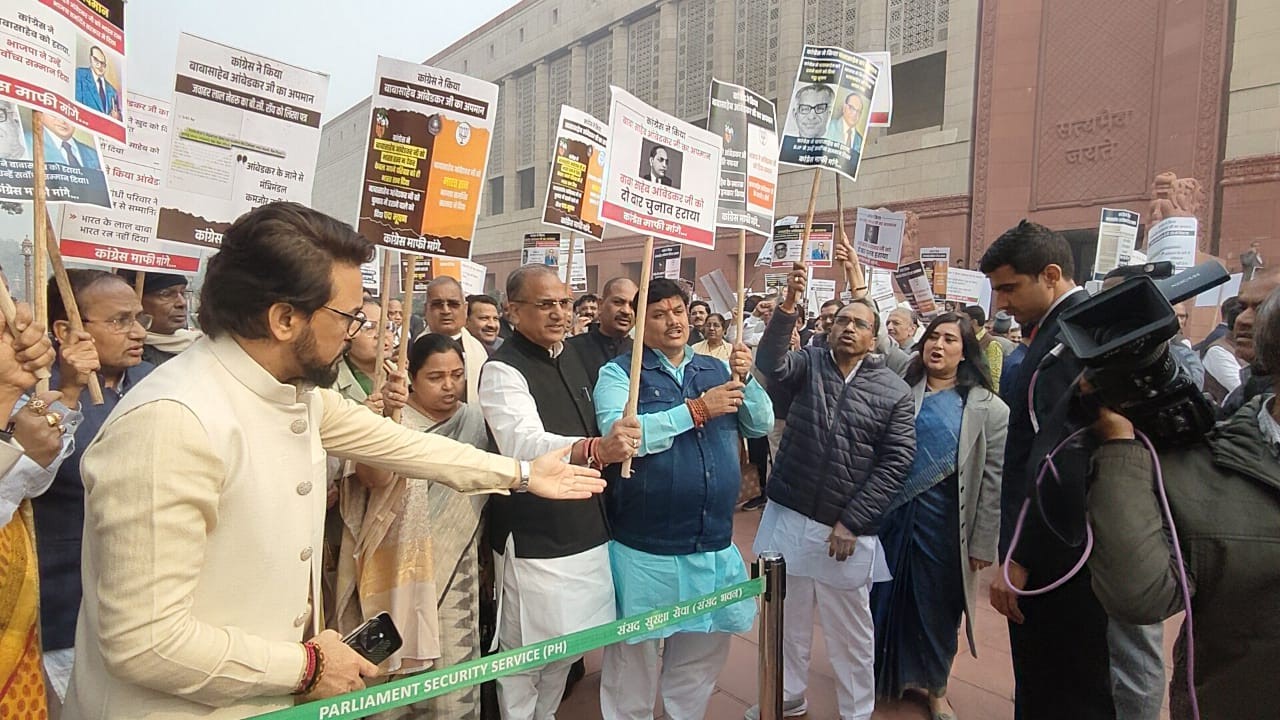 कांग्रेस नेताओं द्वारा बाबा साहेब भीमराव आंबेडकर के अपमान को लेकर गुरुवार को संसद भवन के बाहर भारतीय जनता पार्टी के सांसदों ने पूर्व मंत्री अनुराग ठाकुर के नेतृत्व में प्रदर्शन किया। इसमें उदयपुर सांसद मन्नालाल रावत भी कांग्रेस के खिलाफ मुखर हुए। उल्लेखनीय है कि केंद्रीय गृह मंत्री अमित शाह की भीमराव आंबेडकर पर टिप्पणी को लेकर गुरुवार को भाजपा की ओर से प्रोटेस्ट हो रहा था। कांग्रेस सांसदों ने धक्का.मुक्की शुरु कर दी। जिससे बीजेपी सांसद प्रताप चंद्र सारंगी और मुकेश राजपूत चोटिल हो गए। अनुराग ठाकुर के नेतृत्व में भाजपा नेताओं ने कांग्रेस पार्टी माफी मांगोंए राहुल गांधी माफी मांगों और बाबा साहेब का यह अपमानए नहीं सहेगा हिन्दुस्तान जैसे नारे लगाए। सांसद मन्नालाल रावत ने कहा कि कांग्रेस ने अपने कार्यकाल में कई बार संविधान में बदलाव किए। केवल चुनाव जीतने के लिए कांग्रेस नेताओं ने भाजपा पर संविधान में बदलाव करने का आरोप लगाया। इसके बावजूद जनता ने कांग्रेस को कई चुनावों में नकार दिया है। गुरुवार को भी कांग्रेस नेताओं ने देश की जनता के सामने सिर्फ झूठ बोला।