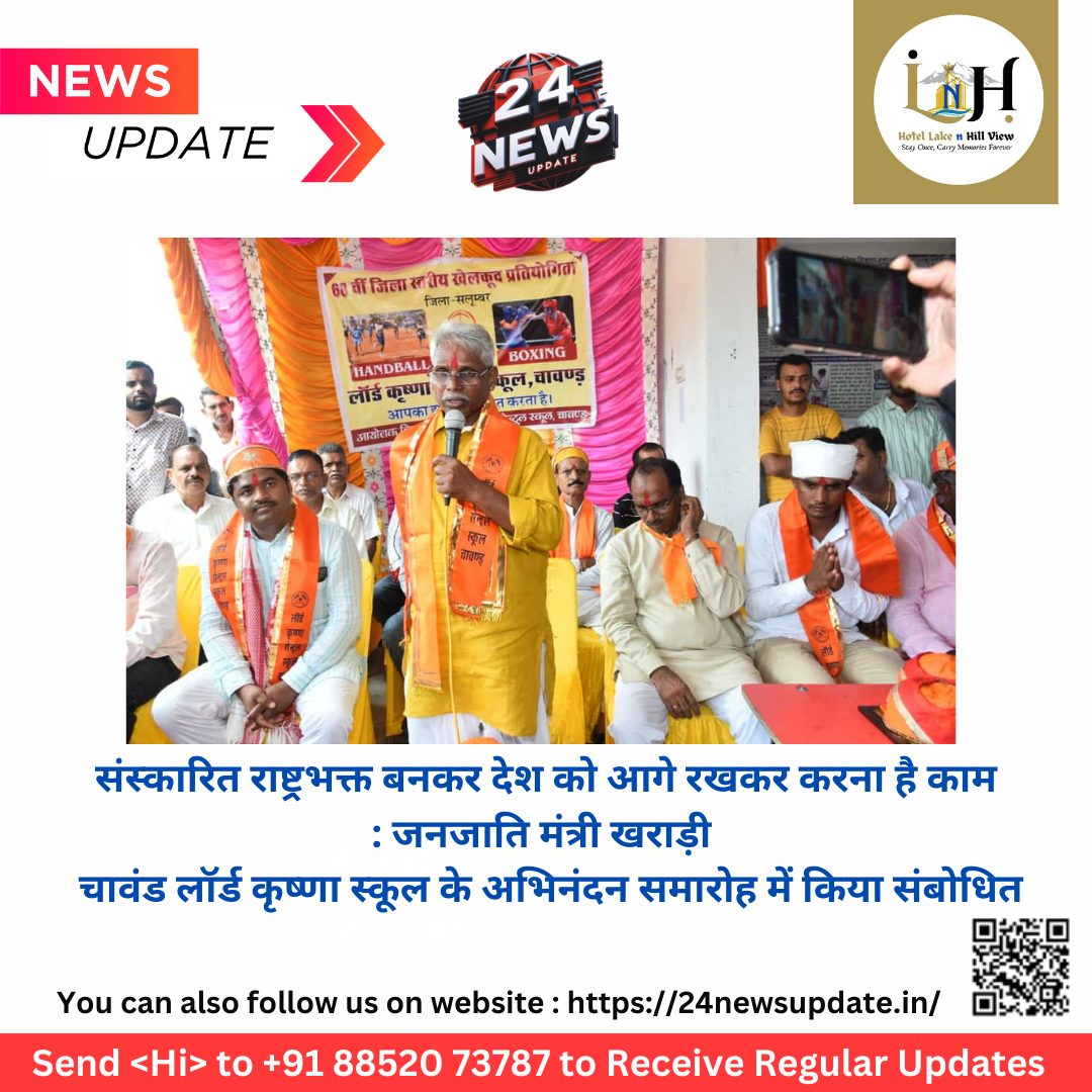 24 न्यूज़ अपडेट सराड़ा। जनजाति क्षेत्रिय विकास मंत्री बाबूलाल खराडी महाराणा प्रताप की निर्वाण स्थली चावंड स्थित लॉर्ड कृष्णा सेन्ट्रल स्कूल में बतौर मुख्य अतिथि यहां विद्यार्थियों और ग्रामीणों को संबोधित करते हुए कहा कि जिस विद्यालय के नाम से ही संस्कार की महक आती हो वहां निश्चित संस्कार युक्त और राष्ट्रीय चेतना को जागृत होती है। कहा की आने वाला भविष्य बालकों के कंधो पर है। संस्कारित और राष्ट्रभक्त बननें की प्रेरणा देते हुए सर्वेश्रेष्ठ बनकर देश को तरक्की की और ले जाने की बात कही। एक कहानी के माद्य्यम से स्कूल की शिक्षा से बालकों के जीवन और संस्कार पर प्रभाव को समझाया। इस मौके पर कार्यक्रम की अध्यक्षता उदयपुर सांसद डॉ. मन्नालाल रावत ने विद्यालय प्रबंध निदेशक मनोज व्यास और जयेश व्यास ने अतिथियों का तिलक, उपरणा, पगडी और श्रीराम की तस्वीर भेंट कर स्वागत किया। उदयपुर सांसद डा श्री रावत ने कहा कि विद्यालय आना और सिखना प्रत्येक के लिए बहुत जरूरी होता है। गुरूजनों के सानिध्य मे अच्छा सिखकर सकारात्मक भाव से समाज में एक दूसरे को जोड़ने की बात कही।