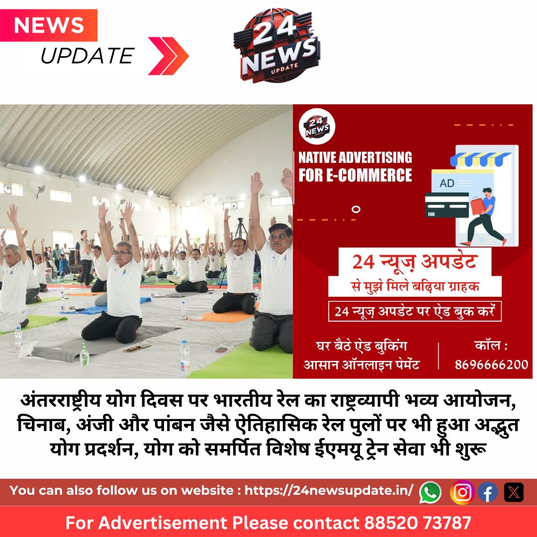 24 NEW UPDATE नई दिल्ली, 21 जून। अंतरराष्ट्रीय योग दिवस 2025 पर भारतीय रेल ने पूरे देश में ऐतिहासिक, व्यापक और भव्य योग आयोजनों की श्रृंखला के साथ एक नया कीर्तिमान स्थापित किया। “योगा फॉर वन अर्थ, वन हेल्थ” की भावना को साकार करते हुए यह आयोजन सभी रेल ज़ोन, मंडलों, स्टेशनों, रेल परिसरों और यहां तक कि भारत के इंजीनियरिंग चमत्कारों पर भी किया गया।