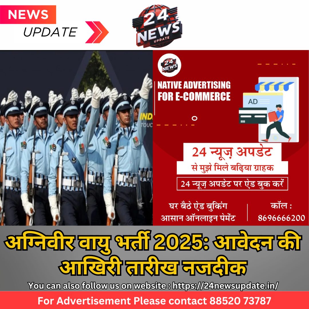 24 न्यूज अपडेट. नई दिल्ली। इंडियन एयरफोर्स में अग्निवीर वायु भर्ती के लिए आवेदन की प्रक्रिया 7 जनवरी से शुरू हो चुकी है। उम्मीदवार 2 फरवरी 2025 तक आवेदन कर सकते हैं। पहले यह तारीख 27 जनवरी थी, जिसे अब बढ़ा दिया गया है। आवेदन के लिए आधिकारिक वेबसाइट agnipathvayu.cdac.in पर जाएं।