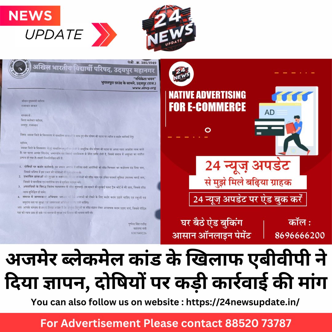 24 न्यूज अपडेट, उदयपुर। ब्यावर जिले के बिजयनगर में हुई नाबालिग स्कूली छात्राओं के सामूहिक यौन शोषण की घटना पर आज उदयपुर में जिला कलेक्ट्री पर अपना गहरा आक्रोश व्यक्त करते हुए घटना के विरोध अखिल भारतीय विद्यार्थी परिषद ने ज्ञापन दिया। एबीवीपी का कहना है कि यह घटना अत्यंत निंदनीय, अमानवीय एवं जिहादी मानसिकता से प्रेरित प्रतीत होती है, जिससे समाज में असुरक्षा का माहौल उत्पन्न हो गया है। इसी को लेकर हम आज जिला कलेक्ट्री पर यह मांग करते है कि दोषियों पर कठोर कार्रवाई की जाए। इस जघन्य अपराध में संलिप्त सभी आरोपियों को शीघ्र गिरफ्तार कर कठोरतम दंड दिया जाए, जिससे भविष्य में इस प्रकार की घटनाओं की पुनरावृत्ति न हो।प्रभावित छात्राओं को सुरक्षा व सहायताः पीड़ित छात्राओं को शीघ्र न्याय एवं उचित परामर्श सुविधा उपलब्ध कराई जाए, जिससे वे मानसिक एवं शारीरिक रूप से सुरक्षित महसूस करें। अपराधियों के विरुद्ध विशेष न्यायालय में शीघ्र सुनवाईः इस मामले की सुनवाई फास्ट ट्रैक कोर्ट में की जाए, जिससे शीघ्र न्याय सुनिश्चित हो सके और समाज में जागरूकता अभियानः प्रशासन को ऐसे अपराधों को रोकने के लिए कठोर कदम उठाने चाहिए एवं स्कूलों एवं समुदाय स्तर पर सुरक्षा एवं जागरूकता अभियान चलाए जाने चाहिए। Share this: Share on X (Opens in new window) X Share on Facebook (Opens in new window) Facebook More Email a link to a friend (Opens in new window) Email Share on WhatsApp (Opens in new window) WhatsApp Like this:Like Loading... Related Discover more from 24 News Update Subscribe to get the latest posts sent to your email. Type your email… Subscribe Post navigation खाटू श्याम मेला : 10 जोडी रेलसेवाओं में साधारण श्रेणी डिब्बो की अस्थाई बढोतरी कपिल पालीवाल द्वारा सनातनीय काव्य प्रस्तुति “शब्दाभिषेक” का आयोजन