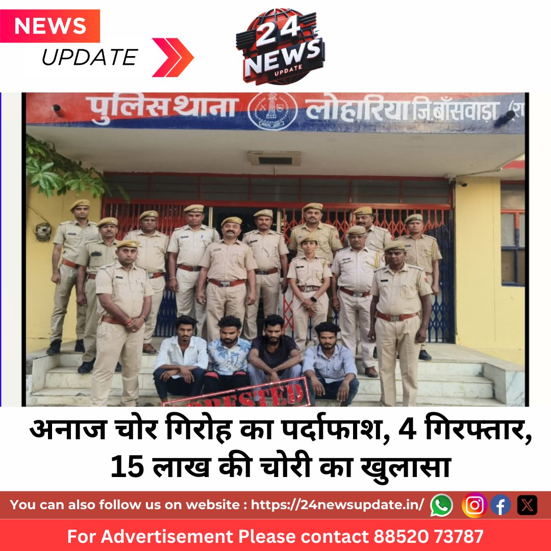 24 News Update बांसवाड़ा। लोहारिया थाना पुलिस ने गोदामों से अनाज और कीमती सामान चुराने वाले एक शातिर गिरोह का पर्दाफाश करते हुए चार अभियुक्तों को गिरफ्तार किया है। इन चोरों ने पिछले कुछ महीनों में कई वारदातों को अंजाम देकर लाखों रुपये का माल उड़ाया था।