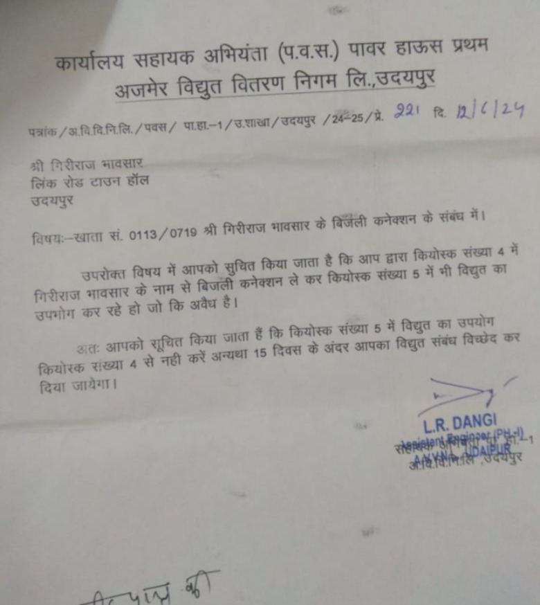 24 न्यूज अपडेट उदयपुर। बिजली निगम के अफसर कमाल के हैं। जिसे कनेक्शन को अवैध बता रहे हैं उसको हटाने के लिए कनेक्शन लेने वाले को 15 दिन का समय दे रहे हैं। हाथों हाथ काट नहीं रहे हैं। उदयपुर में इस तरह की कार्यप्रणाली पहली बार देखने को मिल रही है बाकि होता यह है कि यहां कनेक्शन अवैध पाया, वहां हाथों हाथ जुर्माना लगा कर काट दिया। इस मामले में लगता है कोई रसूख आड़े आ रहा है जिसके चलते अल्टीमेटम दिया गया है ताकि 15 दिन में कोई कानूनी गली निकाल ली जाए। मामला अजमेर विधूत वितरण निगम लिमिटेड का है। बिजली विभाग की नियमावली एवीवीएनएल टी कोस -2021 में वर्णित नियमानुसार कोई भी व्यक्ति स्वयं के स्वामित्व के परिसर मे लिये गए विधुत कनेक्शन से किराये पर, लीज पर, अनुबंध पर,जरिये पॉवर ऑफ एटॉर्नी अथवा अन्य किसी भी प्रकार के एग्रीमेंट से लिए गए अन्य परिसर यथा मकान , फ्लैट, दुकान में उसी कनेक्शन से विधुत उपभोग नही कर सकता यहाँ तक कि कोई भी व्यक्ति अपने मकान , फ्लैट अथवा दुकान के विधुत कनेक्शन या मीटर का संयुक्त उपयोग अपने भाई, पत्नी या पुत्र के परिसर, मकान, फ्लैट या दुकान में भी नही कर सकता। लेकिन अजमेर निगम लिमिटेड के गुलाबबाग पॉवर हॉउस प्रथम के अंतर्गत आने वाले टाऊन हाल लिंक रोड क्षेत्र में नगर निगम के दो अलग अलग अनुज्ञा धारियों को आवंटित कियोस्को में एक अनुज्ञा धारी व्यक्ति द्वारा अन्य अनुज्ञधारी व्यक्ति को आवंटित कियॉस्क में अवैध कब्जा कर दोनों कियोस्को में संयुक्त रूप से एक ही विधुत मीटर का उपयोग किया जा रहा था। जिसके पश्चात अजमेर विधूत वितरण निगम लिमिटेड के पॉवर हॉउस प्रथम के सहायक अभियंता द्वारा दिनाँक 13 जून 24 को पत्रांक /अ. वि. वि. नि. लि./ प व स/ पा. हा.-1/उ. शाखा/ उदयपुर/24-25/प्रे. 221 जारी कर कियॉस्क संख्या 4 के बिजली कनेक्शन का उपयोग अवैध रूप से कियॉस्क संख्या 5 में करने को अवैध बताते हुए 15 दिवस में कनेक्शन हटाने हेतु आदेशित किया, ऐसा नही किये जाने पर संबंध विच्छेद / कनेक्शन काटने की चेतावनी दी। ऐसा ही गैर कानूनी कृत्य एक अन्य कियॉस्क में भी किया गया है जिसमें मृतक के कियोस्क के दस्तावेज पर विधुत कनेक्शन प्राप्त किया गया है।