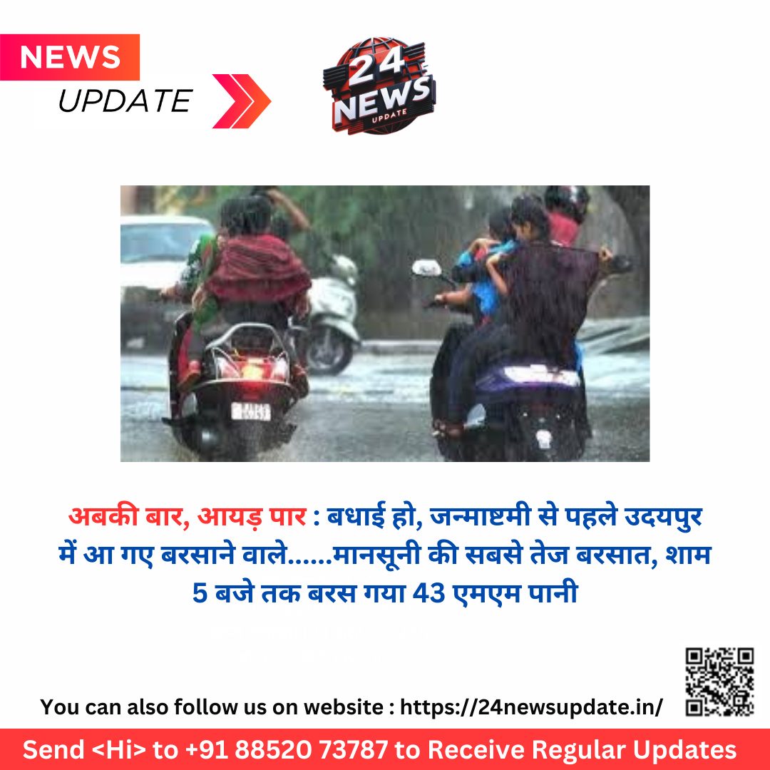 24 न्यूज अपडेट. उदयपुर। झीलों की नगरी में आज की बारिश रिकॉर्ड तोड रही है। इस मौसम की आज सबसे तेज बारिश हुई है। मानसूनी बादलों ने जन्माष्टमी से पहले धुंआधार बारिश करते हुए दोपहर में पानी बरसाना शुरू किया। शाम को 5 बजे तक के आंकड़ों में उदयपुर में अब तक 43 एमएम पानी बरस चुका है। दोपहर में बारिश का नजारा मनमोहक रहा व लोगों का दिल खुश हो गया। बारिश हालांकि दो इंच से कम है लेकिन जो खुशियां आज मिली है उसे बयां करना मुश्किल है। शहर की बारिश का यह शो पोल खोलने वाला भी रहा जिसमें कई जगह जल जमाव हो गया । यह आने वाले दिनों के लिए चेतावनी भी है कि कहीं उदयपुर की हालत जयपुर जैसी ना हो जाए। समय रहते यदि नाले और सिवरेज की लाइन की सफाई नहीं हुई तो जवाब देना नगर निकायों के लिए भारी पड़ सकता है। बारिश के आंकडों को देखें तो सबसे अधिक बारिश 66 एमएम झाड़़ोल में दर्ज की गई। बारिश का यह दौर आने वाले तीन दिन तक जारी रहेगा। ऐसे में अब सबकी निगाहें आयड़ नदी पर है जिसमें करेडों रूपए का खर्चा करके नदी के बहाव क्षेत्र में विकास के नाम पर कुछ कार्य करवाए गए हैं। लोग देखना चाहते हैं कि बहाव के बाद उनका क्या हश्र होता है। सीसारमा नदी में भी पानी का अच्छा बहाव है व बारिश का झमाझम वाला यह क्रम लगातार रहता है तो झीलों की नगरी आने वाले दिनों में फिर राजस्थान का कश्मीर बन जाएगी।