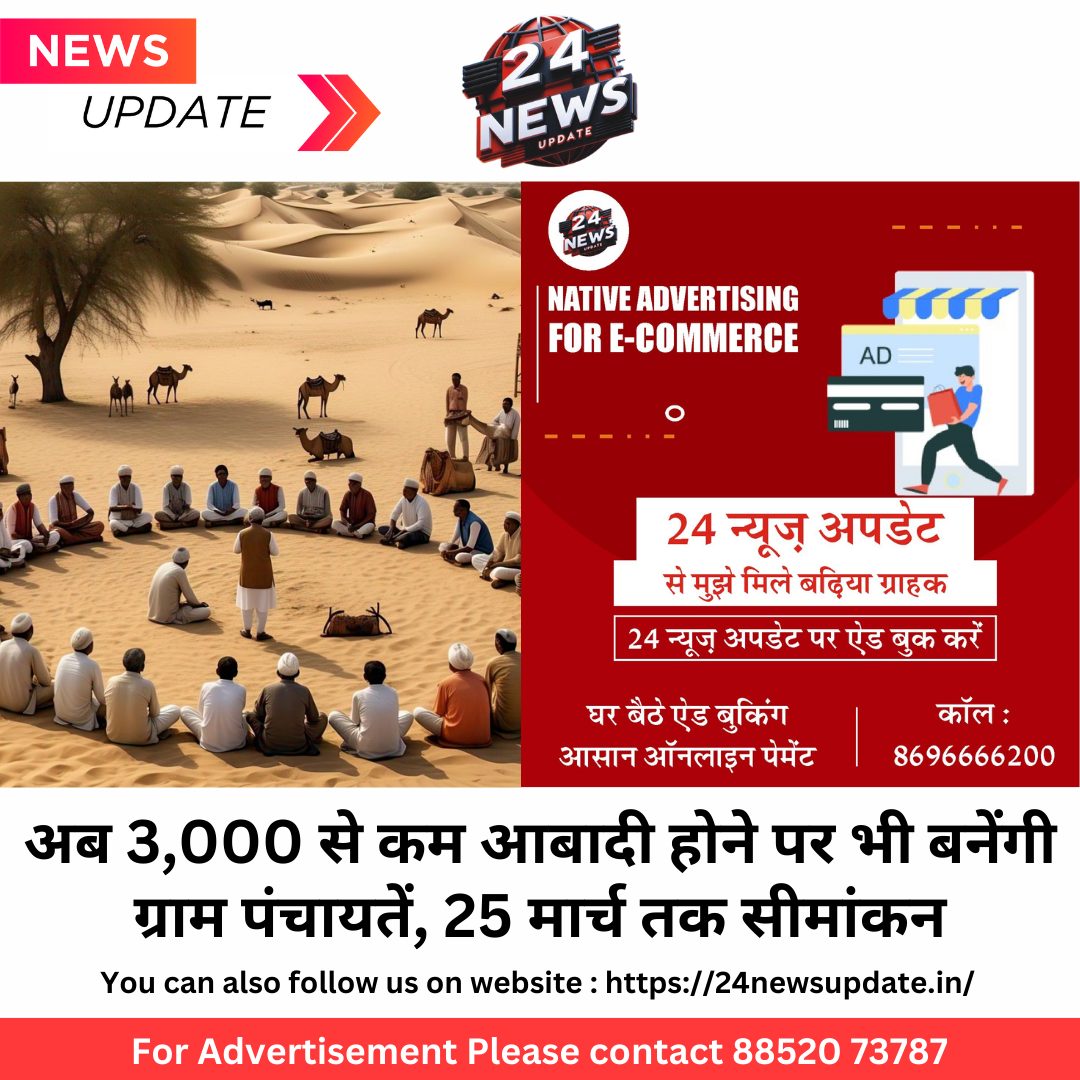 24 न्यूज अपडेट. जयपुर। राजस्थान सरकार ने ग्राम पंचायतों और पंचायत समितियों के पुनर्गठन एवं सीमांकन के नियमों में बदलाव किया है। अब 3,000 से कम जनसंख्या पर भी ग्राम पंचायत बनाई जा सकेगी। इससे राज्य में पंचायतों की संख्या बढ़ने की संभावना है। पहले न्यूनतम आबादी 3,000 से 5,500 तक तय की गई थी। नए नियमों में 15 परसेंट तक कम जनसंख्या वाली ग्राम पंचायतों का भी प्रस्ताव भेजा जा सकता है। इससे छोटे गांवों को भी अपनी पंचायत बनाने का अवसर मिलेगा। मरुस्थलीय जिलों की संख्या बढ़ाई पहले मरुस्थलीय जिलों में बीकानेर, बाड़मेर, जैसलमेर और जोधपुर शामिल थे। चूरू, बालोतरा और फलोदी को भी जोड़ा गया है। इन जिलों में ग्राम पंचायतों के लिए न्यूनतम आबादी 2,000 और अधिकतम 4,000 तय की गई है। पहले सीमांकन की अंतिम तारीख 18 फरवरी थी, जिसे अब 25 मार्च तक बढ़ा दिया गया है। 26 मार्च से 25 अप्रैल तक आपत्तियां मांगी जाएंगी। आपत्तियों का निपटारा 26 अप्रैल से 5 मई के बीच किया जाएगा। 15 मई तक प्रस्ताव राज्य सरकार को भेजे जाएंगे और 30 मई तक अंतिम मंजूरी दी जाएगी। Share this: Share on X (Opens in new window) X Share on Facebook (Opens in new window) Facebook More Email a link to a friend (Opens in new window) Email Share on WhatsApp (Opens in new window) WhatsApp Like this:Like Loading... Related Discover more from 24 News Update Subscribe to get the latest posts sent to your email. Type your email… Subscribe Post navigation RPSC ने जारी किया लेक्चरर- (आयुर्वेद, योग व प्राकृतिक चिकित्सा, यूनानी, सिद्धा एवं होम्योपैथी विभाग) भर्ती का विज्ञापन पर्यटन गीत ‘महारो देश’ का जिला कलक्टर ने किया विमोचन