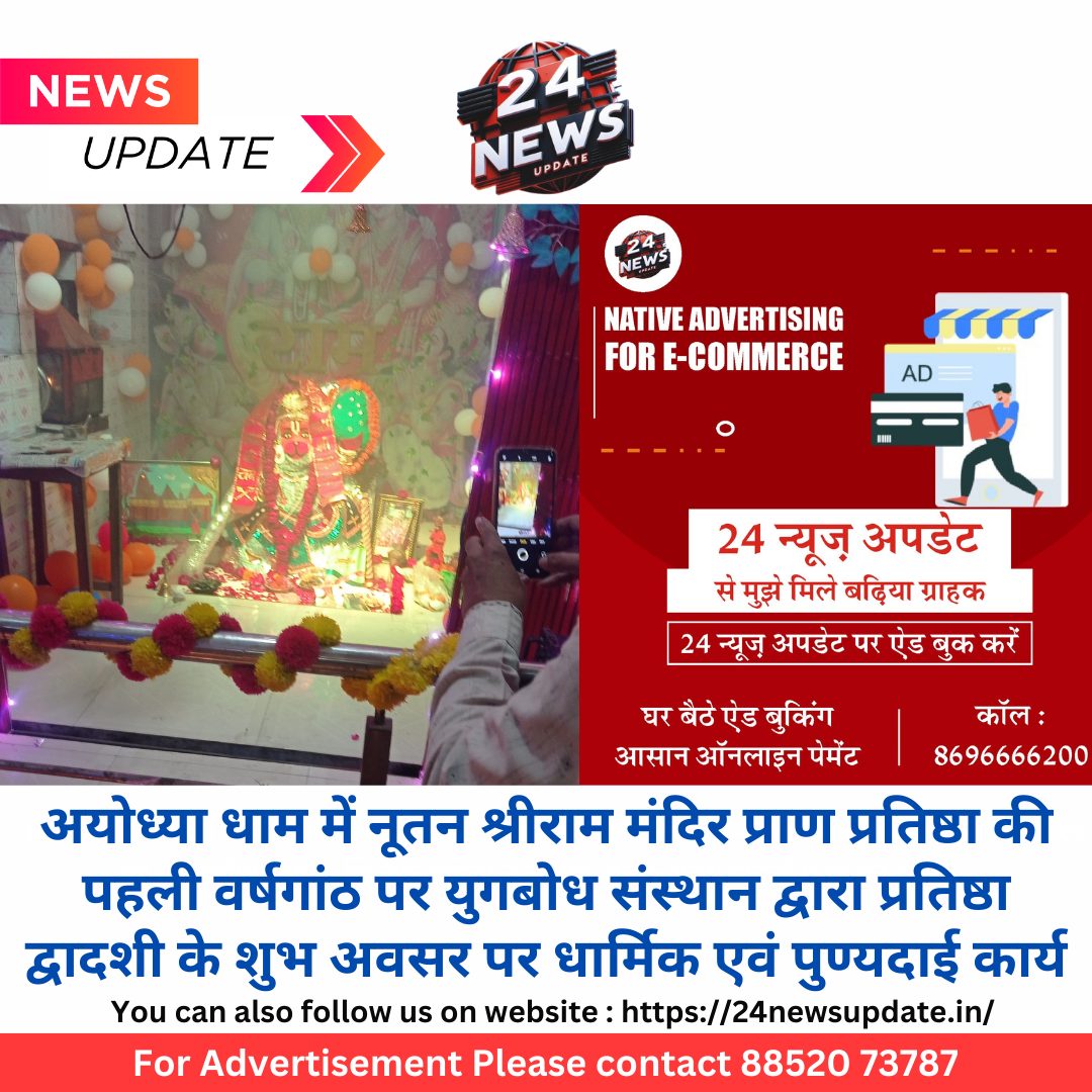 कविता पारख 24 न्यूज़ अपडेट निम्बाहेडा। श्री अयोध्या धाम में नूतन श्रीराम मंदिर प्राण प्रतिष्ठा की पहली वर्षगांठ पर युगबोध संस्थान द्वारा शनिवार को प्रतिष्ठा द्वादशी के शुभ अवसर पर धार्मिक एवं पुण्यदाई कार्य किये गये। संस्थान के प्रचार प्रमुख हिमांशु आचार्य ने बताया कि इस अवसर पर स्थानीय मोड़ के बालाजी मंदिर में बालाजी महाराज का फूल माला एवं श्रीराम नाम अंकित उपरना ओढ़ाकर विशेष मिष्ठान एवं मंदिर परिसर में ही तैयार किया गया रोट का भोग लगाया गया। संस्थान सह-प्रमुख् महेश शर्मा के अनुसार देव दर्शन कर सामूहिक श्रीराम स्तुति एवं हनुमान चालीसा का पाठ किया गया। मंदिर के व्यवस्थार्थ घी, बड़ा अगरबत्ती पैक, माचिस पूड़ा, रूई, गुड़, चना एवं सुखा प्रसाद समर्पित किया गया।मंदिर में चल रहे छुटपुट निर्माण कार्य में 1101/ रुपये की भागीदारी निभाई गयी। इससे पूर्व संगठनात्मक बैठक कर विभिन्न बिंदुओं पर चर्चा की गयी। संस्थान को और अधिक गतिशील करने एवं विभिन्न मंदिरों से जुड़ते हुए पाक्षिक रूप से कार्यक्रम करते रहने का सर्व सम्मति से निर्णय लिया गया।इस अवसर पर संस्थान के बी.सी. पाण्डेय, श्याम सुंदर झंवर, अनिल कोठारी, मुरली शर्मा, गेंदालाल कोटवाल, महेश शर्मा,हिमांशु आचार्य, राजूलाल मीणा, चिरंजीलाल बैरवा, रामकेश मीणा, प्रद्युम्न आचार्य, स्वास्तिक पाण्डेय आदि सदस्यगण सहित मंदिर के पुजारी जी एवं भक्तगण उपस्थित रहे। Share this: Share on X (Opens in new window) X Share on Facebook (Opens in new window) Facebook More Email a link to a friend (Opens in new window) Email Share on WhatsApp (Opens in new window) WhatsApp Like this:Like Loading... Related Discover more from 24 News Update Subscribe to get the latest posts sent to your email. Type your email… Subscribe Post navigation निःशुल्क नेत्र चिकित्सा शिविर का हुआ आयोजन पिताजी की पुण्य स्मृति में निकुम्भ के भिण्डवाल परिवार ने लोहार समाज के विशाल सभागार व छात्रावास भवन निर्माण कार्य में 21,000 रुपए का सहयोग किया
