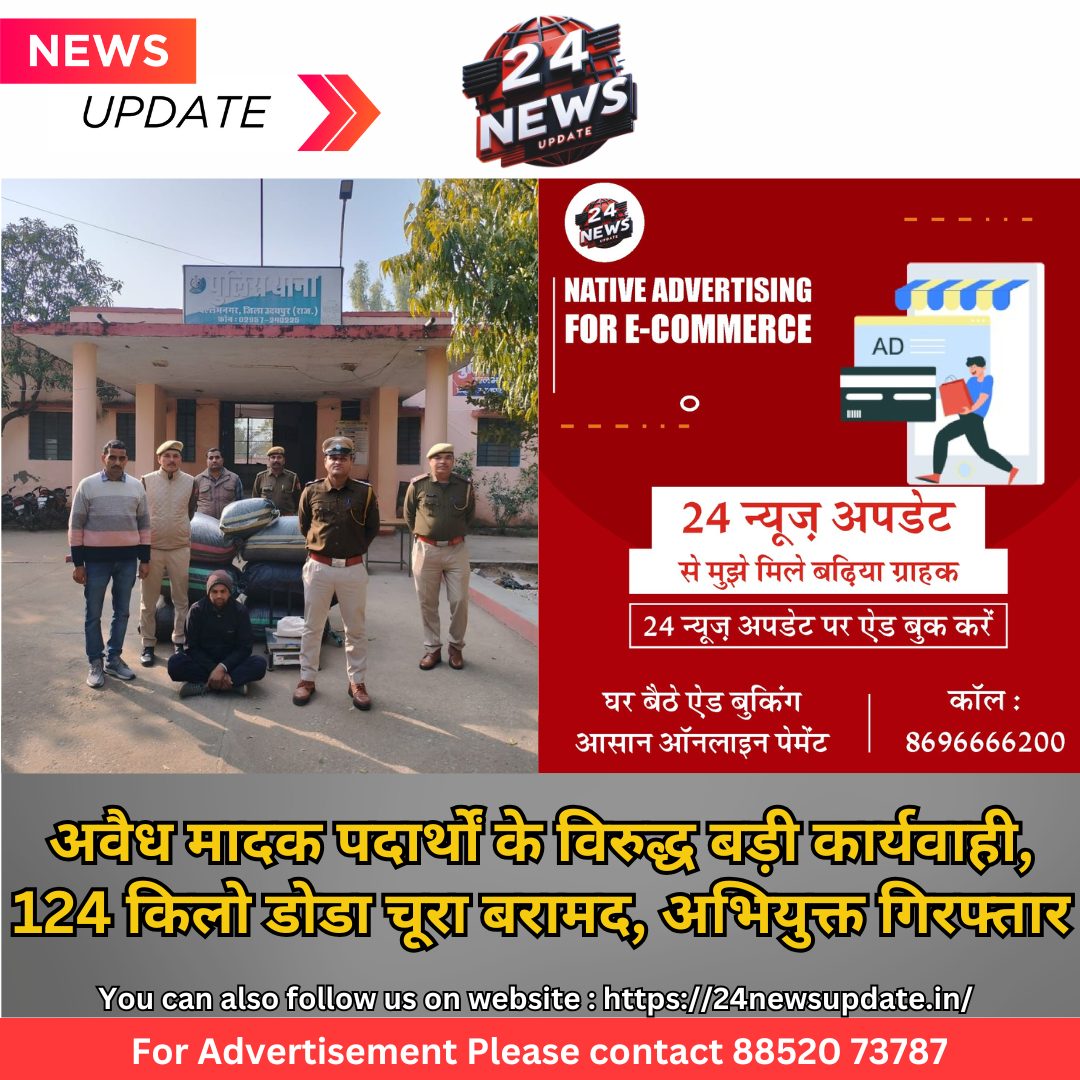 24 न्यूज अपडेट. उदयपुर। जिला पुलिस अधीक्षक योगेश गोयल की ओर से अवैध मादक पदार्थों के विरुद्ध चलाये जा रहे अभियान के तहत अंजना सुखवाल अतिरिक्त पुलिस अधीक्षक, खेरवाडा व राजेन्द्र सिंह जैन वृत्ताधिकारी वृत वल्लभनगर के सुपरविजन में दिनेश पाटीदार थानाधिकारी, वल्लभनगर के नेतृत्व में टीम की ओर से सर्कल गश्त गांव बडगांव में दो संदिग्ध सफेद कलर की कारों पीछा किया। परन्तु दोनों सफेद कार रात का समय होने से भागने में सफल रही। जिस पर टीम द्वारा दोनों कार जिस घर से निकली उसके मालिक गोवर्धन पिता रामलाल निवासी बडगांव पुलिस थाना वल्लभनगर जिला उदयपुर की उपस्थिति में उसके घर की तलाशी ली गई। जिसके एक कमरे में 7 काले रंग के कट्टे मिले उन सभी प्लास्टिक कट्टों को खोलकर कर चैक किया गया तो उसमें अवैध मादक पदार्थ डोडा चूरा वजन 124 किलोग्राम होना पाया गया जिसको जब्त किया गया। इसके अलावा मौके से डोडा चूरा के अवैध परिवहन में प्रयुक्त तीन मोटरसाईकिल को भी जब्त किया गया। प्रारम्भिक पूछताछ पर अभियुक्त गोवर्धन ने उक्त डोडा चूरा उसके सिजारी कालूलाल निवासी बडगाव, विपिन एवं विपिन का दोस्त विरदाराम निवासी बाडमेर द्वारा मिलकर संग्रहण करना बताया। अभियुक्त गोवर्धन को धारा 8/15, 8/25 एनडीपीएस एक्ट के तहत गिरफतार किया जाकर अभियुक्त से अनुसंधान जारी है।
