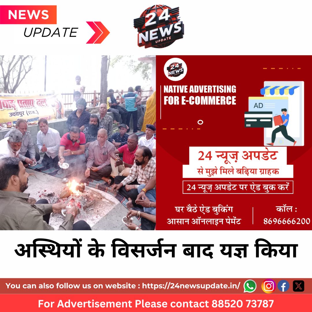 24 News Update उदयपुर l मेवाड़ प्रताप दल सेवा संस्थान द्वारा लावारिस एवं असहाय परिजनों की अस्थियों को हरिद्वार में सामूहिक विसर्जित किया गया था l इनकी आत्माओं की शान्ति के जलबुर्ज मंदिर परिसर में परिजनो की मौजूदगी में यज्ञ का कार्यक्रम कर आहुतियां परिजनो से करायी l यह जानकारी संस्थान के जिला सचिव राकेश पालीवाल ने देते हुए बताया कि लगभग 70 परिवारो ने भाग लिया l इस अस्थि विसर्जन कार्य में सहयोग करने वाले भामाशाहो एवं कार्यकर्ताओ को उपरना पहनाकर प्रतीक चिह्न दिए गए l यह कार्य संस्थापक लाला सालवी के सानिध्य में आयोजित हुआ जिसमे मोहन सालवी, ओंकार जोशी,शिव शंकर नागदा, बलवंत सालवी, शेर सिंह राठौड़, महिला अध्यक्ष मंजू गहलोत, हेमलता माली, नरेंद्र मनौती, सुनील अहीर, प्रेम राज माली, राजकुमार माली, शैलेन्द्र गावरी, तीर्थपाल सिंह राठौड़ आदि को सम्मानित किया गया l कार्यक्रम के बाद स्नेह भोजन का आयोजन किया गया l Share this: Share on X (Opens in new window) X Share on Facebook (Opens in new window) Facebook More Email a link to a friend (Opens in new window) Email Share on WhatsApp (Opens in new window) WhatsApp Like this:Like Loading... Related Discover more from 24 News Update Subscribe to get the latest posts sent to your email. Type your email… Subscribe Post navigation उदयपुर में सोना बना ‘लखपति’, पहली बार 10 ग्राम का भाव 1 ‘‘पेटी’’ पार, सर्राफा बाजार में ऐतिहासिक उछाल प्रधानमंत्री जन आरोग्य योजना के अंतर्गत उदयपुर में शुरू हुई इंटरस्टेट पोर्टेबिलिटी सेवा, मेडिकल टूरिज्म का हब बन रहा है शहर