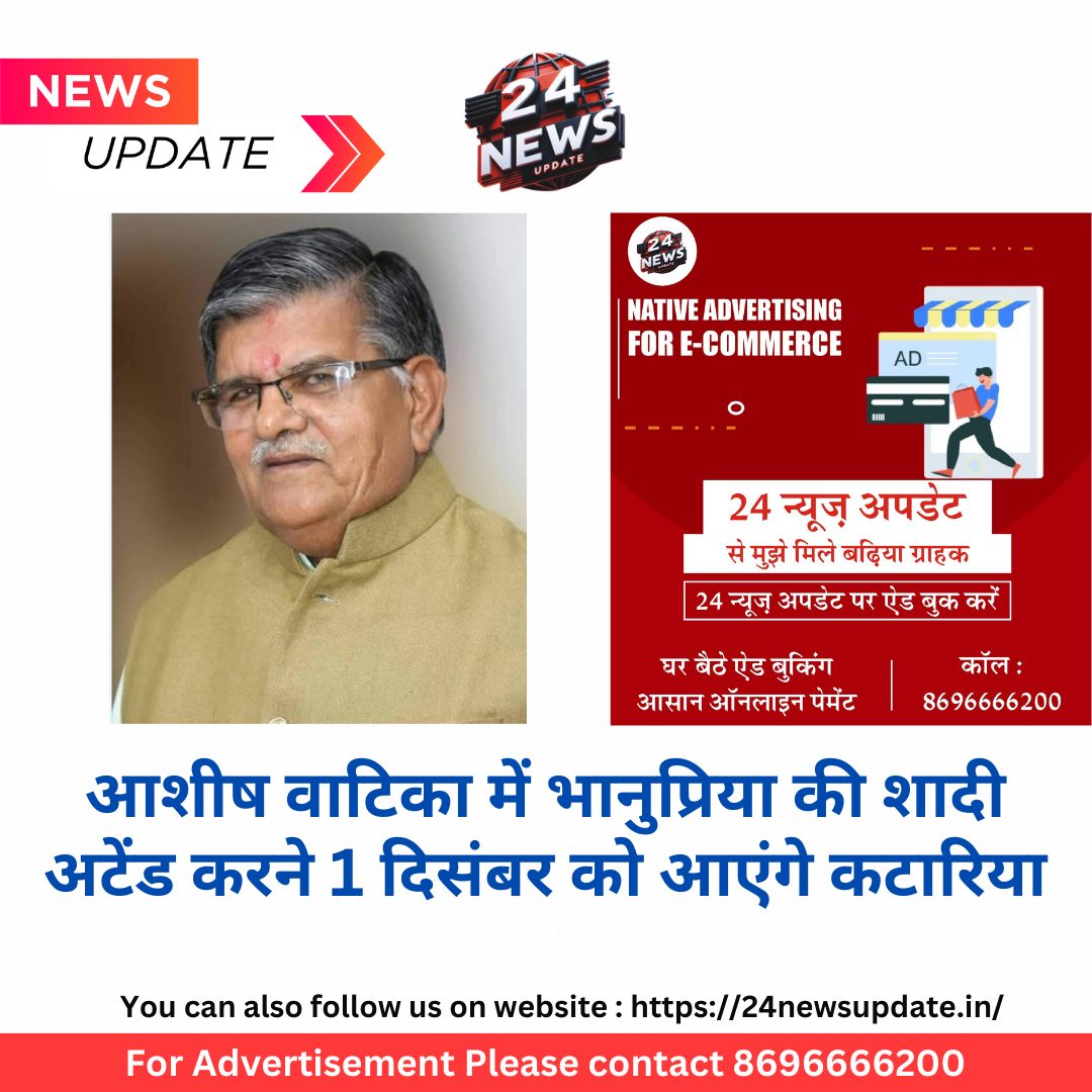 24 न्यूज अपडेट उदयपुर। पंजाब के राज्यपाल एवं चंडीगढ़ के प्रशासक गुलाबचंद कटारिया 1 दिसंबर को उदयपुर में एक दिन के प्रवास पर रहेंगे। कटारिया यहां पर आशीष वाटिका में भानूप्रिया पुत्री डॉक्टर प्रेमा के विवाह समारोह में शामिल होंगे। यह जानकारी समाजसेवी चंचल अग्रवाल ने दी।