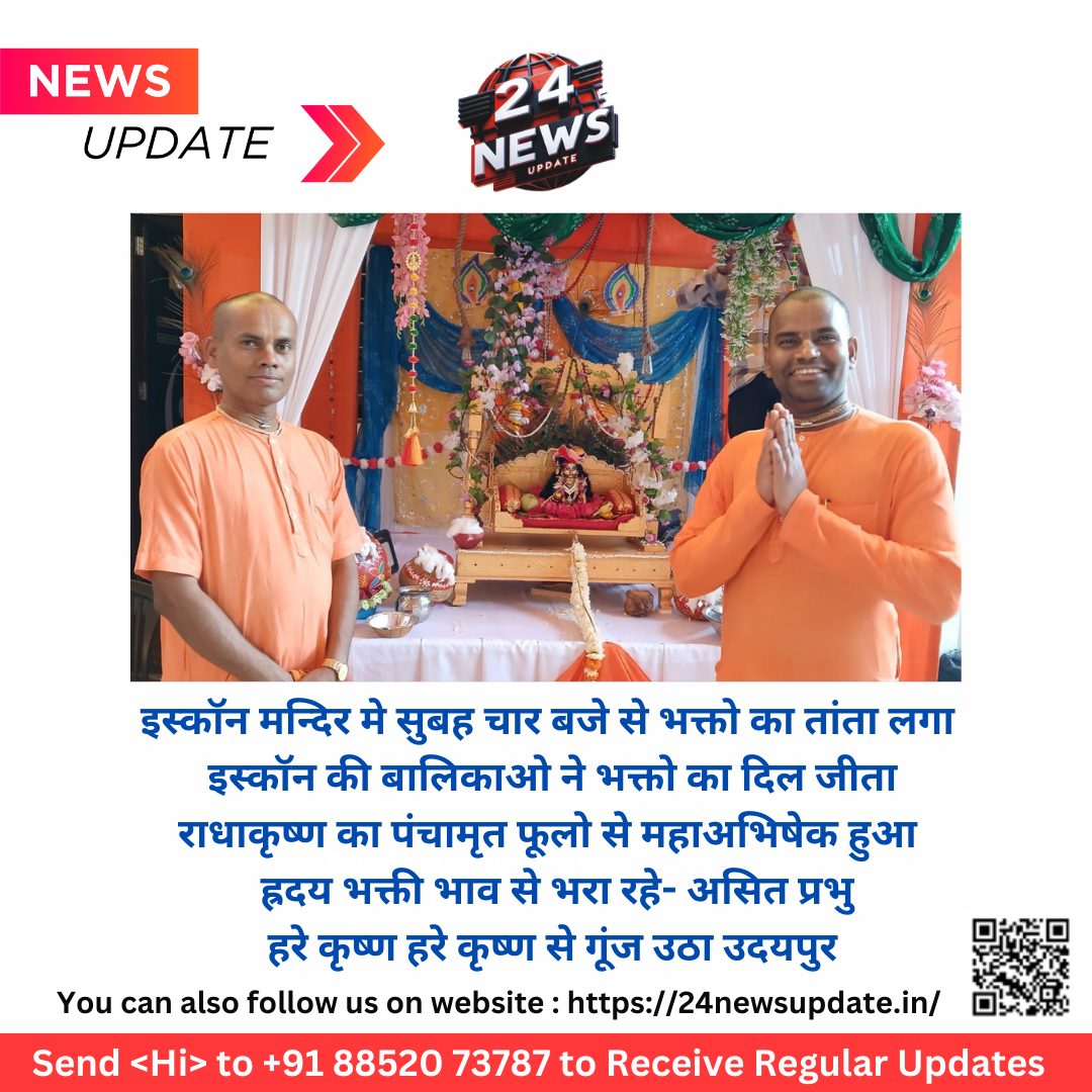 24 न्यूज़ अपडेट उदयपुर. गंगूकुण्ड स्थित इस्काॅन मन्दिर मे आज सुबह चार बजे मंगला आरती से ही भक्तो का तांता लगने लगा, जो धीरे धीरे बढता चला गया। मायापुर वासी ने बताया कि देर शाम तक मन्दिर प्रांगण अंदर बाहर से खचाखच भर गया। भक्त जन लाईन से दर्शन करने आ रहे थे तो वैष्णव भक्त भी हर संभव सहयोग करते रहे। वही इस्काॅन भक्तो के बच्चो ने बहुत सुंदर आकर्षक नृत्यो व नाटिकाओ से भक्तो का दिल जीत लिया। जो सभी के लिए आश्चर्य रहा। लगातार बारिश होने से बाहर पाण्डाल मे पानी भरने से मन्दिर के अन्दर हाल मे कार्यक्रम किया।भक्तो की भीड अधिक होने से व गाड़ी पार्क करने मे कुछ को असुविधा रही तो बड़े एल ई डी स्क्रीन से बहुत सुविधा रही।नौ बजे पंचामृत गगांजल आदि से तथा फूलो से राधा कृष्ण का महाअभिषेक किया पश्चात जगन्नाथ जी के समक्ष 10,000 तरह के छप्पन भोग प्रसाद धराया। इस्काॅन भक्तो की पवित्रता शुद्धता मृदुव्यवहार तथा मर्यादित वेषभूषा सभी को प्रभावित कर रही। अनेक गणमान्य जनो ने भी दर्शन अभिषेक किया।इससे पूर्व भजन कीर्तन के बाद दिल्ली के असित प्रभु ने कथा मे बताया कि हमारा ह्रदय अंदर से भक्ति भाव से भरा रहना चाहिए।सत्संग हमे विकारो से मुक्त कर संस्कारो से युक्त करता है। भगवान कहते है-या तो मुझको छोड दो या मुझ पर छोड दो। सभी भक्तो के लिए सागाहारी फलाहरी प्रसाद की व्यवस्था पूरे समय जारी रही। देर रात तक मन्दिर की ओर से सजाई दुकानो पर भीड लगी रही।आरती पश्चात सभी को प्रसाद परोसा गया