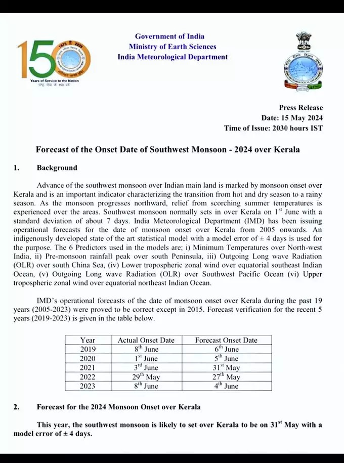 मौसम विभाग के मुताबिक, केरल में 1 से 3 जून, तमिलनाडु में 1 से 5 जून, आंध्र प्रदेश में 4 से 11 जून, कर्नाटक में 3 से 8 जून, बिहार में 13 से 18 जून, झारखंड में 13 से 17 जून, पश्चिम बंगाल में 7 से 13 जून, छत्तीसगढ़ में 13 से 17 जून, गुजरात में 19 से 30 जून, महाराष्ट्र में 9 से 16 जून, गोवा में 5 जून, ओडिशा में 11 से 16 जून, उत्तर प्रदेश में 18 से 25 जून, उत्तराखंड में 20 से 28 जून, हिमाचल प्रदेश में 22 जून, दिल्ली मे 27 जून, पंजाब में 26 जून से 1 जुलाई, हरियाणा में 27 जून से 3 जुलाई, चंडीगढ़ में 28 जून और राजस्थान में 25 जून से 6 जुलाई के बीच मानसून दस्तक दे सकता है।