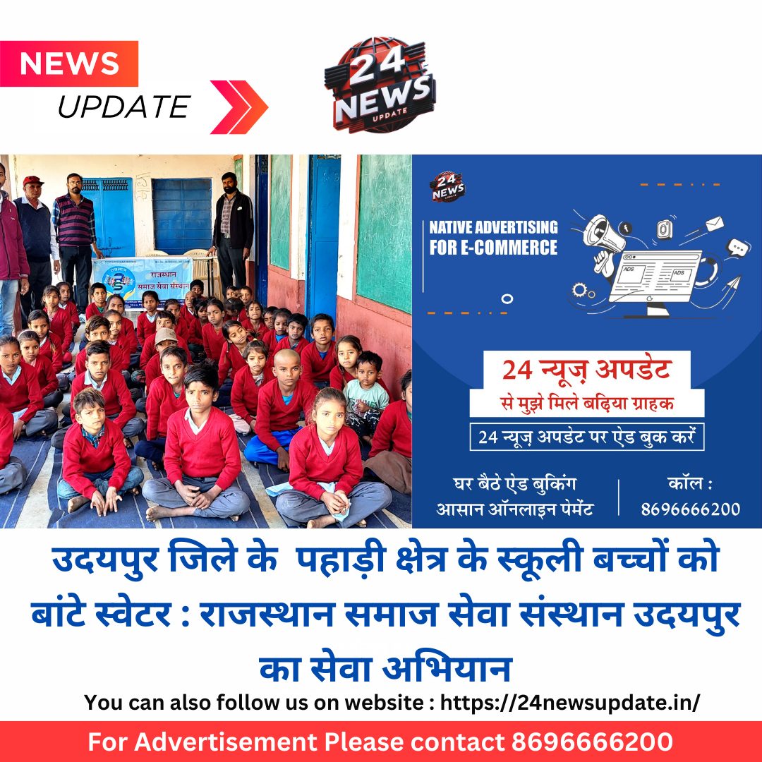 24 न्यूज अपडेट उदयपुर। राजस्थान समाज सेवा संस्थान उदयपुर की और से उदयपुर जिले के पहाड़ी क्षेत्र में स्थित सरकारी स्कूल के बच्चों को स्वेटर वितरित किए गए। संस्थान की सेवा टीम से जुड़े युगलकिशोर जोशी ने बताया कि गोगुंदा पंचायत समिति क्षेत्र के राजकीय प्राथमिक विद्यालय सुभाषपुरा में बच्चों को स्वेटर वितरित किए गए। उदयपुर शहर से 27 किलोमीटर दूर इस स्कूल में बच्चों को चप्पल भी बांटे गए। प्रधानाध्यापक दिनेश शर्मा ने राजस्थान समाज सेवा संस्थान के इस प्रयास की सराहना की। संस्थान अध्यक्ष देवेंद्र शर्मा ने बताया कि जरूरतमंद बच्चों को सर्दी से बचाने यह अभियान लगातार जारी है। कोई भी समाजसेवी भी इसमें सहयोगी बन सकता है। इस सीजन में अब तक तीन स्कूलों में स्वेटर वितरित किए जा चुके है