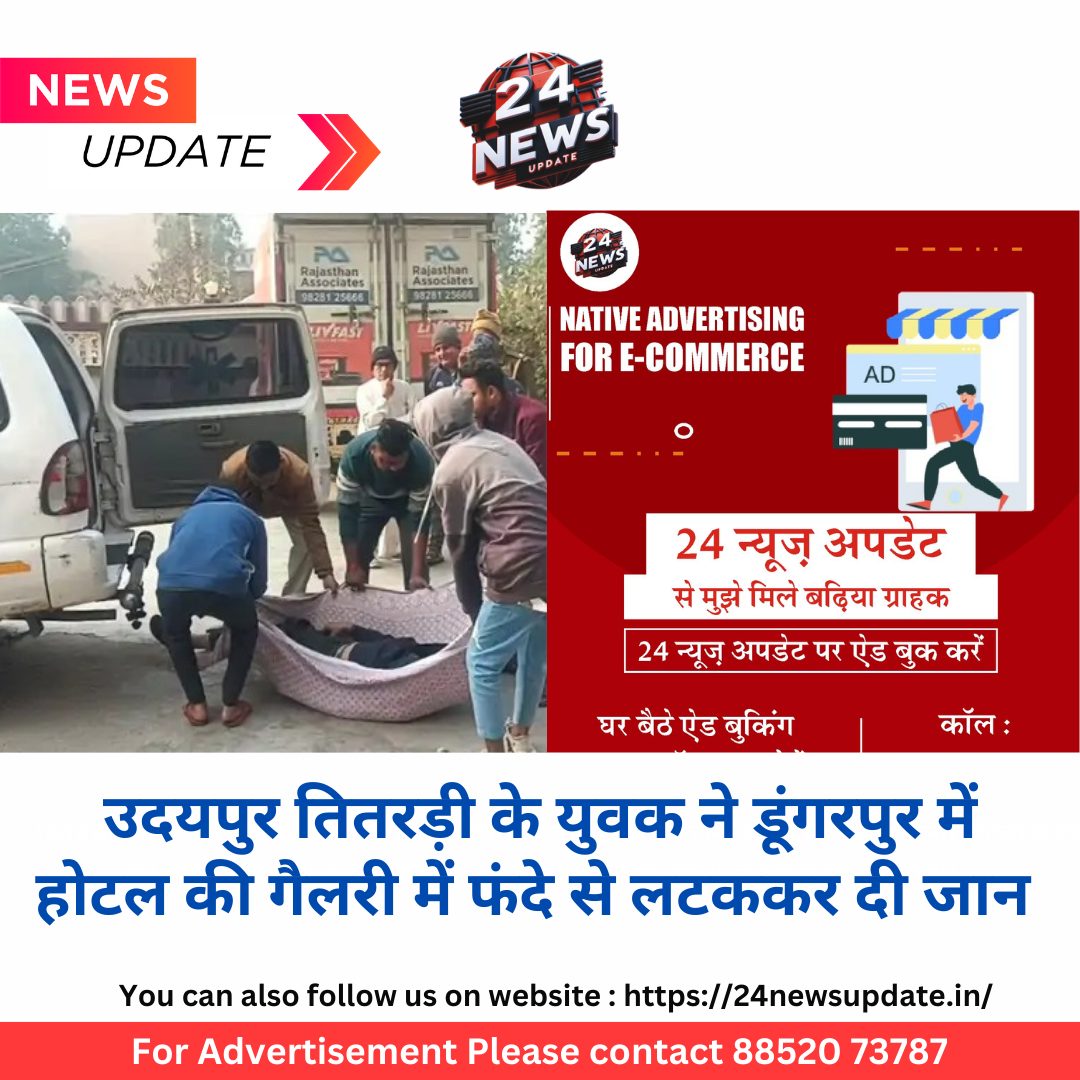 24 न्यूज़ अपडेट डूंगरपुर। मंगलवार सुबह सूचना बस स्टैंड स्थित होटल में युवक ने सुसाइड किया है। पुलिस के अनुसार युवक ने होटल के तीसरी मंजिल की गैलरी में लगी रेलिंग से रस्सी बांधकर फंदा लगाया व कूद गया व सुसाइड कर लिया। पुलिस ने होटल का रजिस्टर खंगाला तो नाम विजेंद्र सुहालका निवासी गोकुल नगर तीतरड़ी उदयपुर बताया गया। पते के आधार पर युवक की पहचान हुई। यह युवक 20 दिसंबर से होटल में ठहरा था। व चार दिन से काम से जाता और शाम को वापस आ जाता। पुलिस ने होटल के सीसीटीवी फुटेज में देखा कि युवक मंगलवार सुबह 4 बजकर 25 मिनट पर अपने कमरे से निकला और रस्सी लेकर जाता हुआ दिखाई दिया। युवक सीधे गैलेरी में गया और फंदा लगाया। पुलिस ने परिजनों को सूचना दी है। शव को डूंगरपुर अस्पताल की मॉर्चुरी में रखवाया गया है। उदयपुर के तीतरड़ी का रहने वाला युवक 4 दिन से होटल में ठहरा हुआ था।