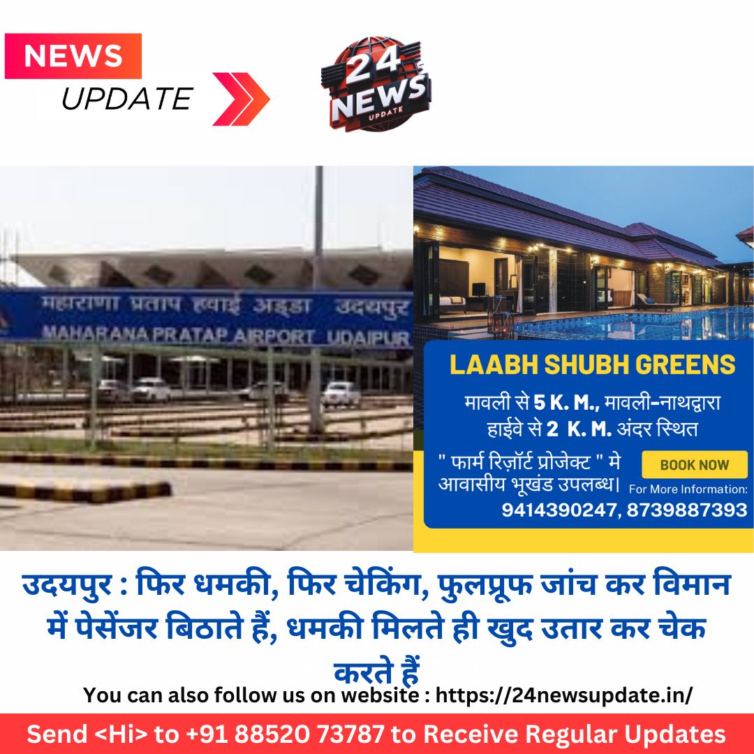 24 न्यूज़ अपडेट उदयपुर। उदयपुर में आज भी विमानों में बम की धमकी का असर देखा गया। लगातार दूसरे दिन शुक्रवार को एक और फ्लाइट को बम से उड़ाने की धमकी के बाद चेक किया गया। इंडिगो की यह फ्लाइट दोपहर 12ः05 बजे उदयपुर से दिल्ली के लिए उड़ान भरने वाली थी। इससे कुछ देर पहले धमकी मिलने की सूचना पर फ्लाइट को रुकवाया गया और पैसेंजर को उतारा कर पूरे विमान की जांच की गई। वहीं संदेश कल जैसा- केबिन क्रू ने एनाउंस किया था कि फ्लाइट को बम से उड़ाने की धमकी मिली है। सभी अपने-अपने बैग और अन्य सामान छोड़कर दूर चले जाएं। पैसेंजर सेफ जोन में चले गए, सामान की जांच हुई व कुछ नहीं मिला। कल भी इसी प्रकार से वाकया सामने आया था। डॉग स्क्वाड और मेटल डिटेक्टर की मदद भी ली गई मगर कुछ नहीं मिला।
