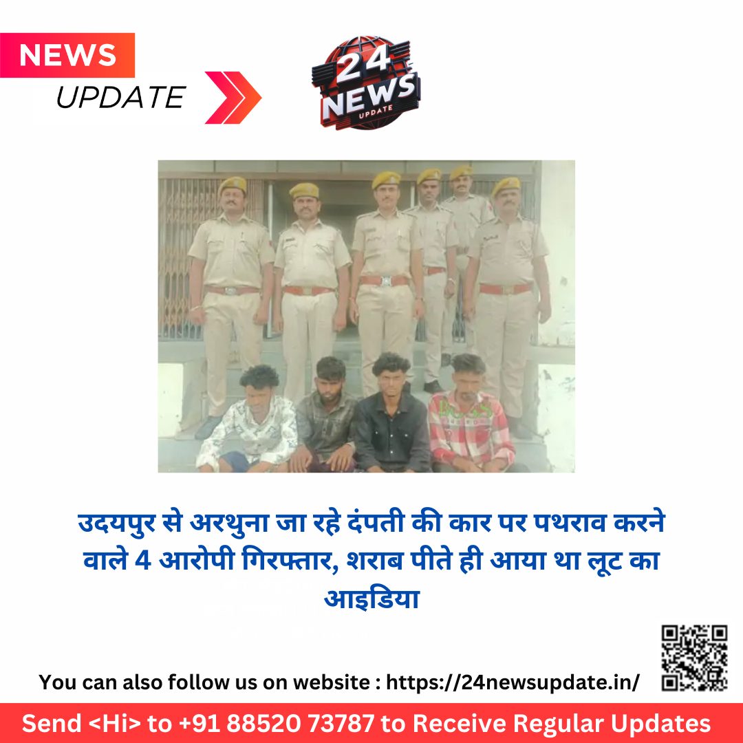 24 न्यूज अपडेट. बांसवाड़ा। बांसवाड़ा के अरथूना पुलिस थाना ने कार पर पथराव करने वाले 4 बदमाशों को गिरफ्तार किया और दो नाबालिगों को डिटेन किया है। आरोपियों ने एक दिन पहले शराब पी थी ओर वाहन चालकों से लूट की उस दौरान रच ली। उन्होंने उदयपुर से आ रही एक कार पर पथराव कर दिया। पत्थरबाजी के कुछ घंटे बाद पुलिस ने 2 नाबालिग समेत 6 को पकड़ लिया।पुलिस ने छोटी बस्सी निवासी निलेश, कमलेश, शंभू और महुडीयापाडा निवासी कांतिलाल को गिरफ्तार किया है। बांसवाड़ा पुलिस अधीक्षक हर्षवर्धन अगरवाला ने बताया- 23 अगस्त को अरथुना पुलिस थाने में एक एफआईआर दर्ज करवाई गई थी। बताया गया कि पीड़ित अपनी पत्नी के साथ कार से उदयपुर से अरथुना गांव आ रहा था। दंपती की कार अरथुना से करीब 2 से 3 किलोमीटर की दूरी पर थी। इस बीच करेटा गांव के पास 5- 6 लड़कों ने उनकी कार पर पत्थरबाजी कर दी। कार चालक रफ्तार बढ़ाकर वहां से भाग निकला। पीड़ित ने पुलिस को शिकायत दी। इसके बाद पुलिस ने पत्थरबाजों की तलाश करने के लिए पुलिस टीम गठित की। कुछ ही घंटों बाद पुलिस ने इस मामले में चार लड़कों को दबोच लिया। पथराव में शामिल लड़के 22 अगस्त को अरथुना तहसील कार्यालय के पास सांसद राजकुमार रोत की ओर से आयोजित कार्यक्रम में शामिल हुए थे। इसके बाद लड़कों ने आईटीआई कॉलेज के पास बैठकर शराब पी। इसी दौरान आरोपियों ने लूट की साजिश रची। लूट की नीयत से पथराव कर वाहनों को रुकवाने की प्लानिंग की। इसके बाद रास्ते पर आने- जाने वाले वाहनों पर पथराव करने लगे। एक कार पर पथराव के बाद पुलिस को सूचना मिली। इसके बाद पुलिस मौके पर पहुंची। मगर आरोपी भाग गए। जिन्हें पुलिस ने कुछ घंटों बाद ही दबोच लिया।