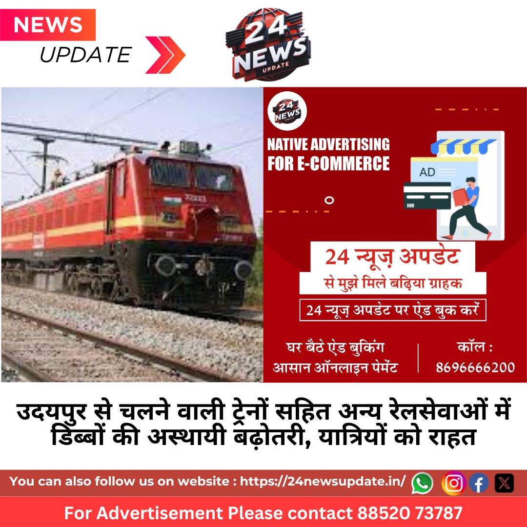 24 न्यूज अपडेट, जयपुर। गर्मियों की छुट्टियों के दौरान यात्रियों की भीड़ को देखते हुए उत्तर पश्चिम रेलवे ने 48 जोड़ी रेलसेवाओं में विभिन्न श्रेणी के 120 डिब्बों की अस्थायी बढ़ोतरी का निर्णय लिया है। मुख्य जनसम्पर्क अधिकारी शशि किरण ने बताया कि खासतौर पर उदयपुर से संबंधित रेलगाड़ियों के साथ-साथ अन्य प्रमुख रेलमार्गों पर भी अतिरिक्त डिब्बे लगाए जाएंगे ताकि यात्रियों को अधिकतम सुविधा मिल सके। उदयपुर सिटी-जयपुर-उदयपुर सिटी रेलसेवा (12991/12992) में 1 मई से 31 मई 2025 तक 2 द्वितीय कुर्सीयान और 1 साधारण श्रेणी डिब्बे जोड़े जाएंगे। जयपुर-उदयपुर सिटी-जयपुर रेलसेवा (09721/09722) में भी जयपुर से 1 मई से 31 मई तथा उदयपुर सिटी से 2 मई से 1 जून तक 1 साधारण श्रेणी डिब्बे की बढ़ोतरी की गई है। इसी प्रकार, उदयपुर सिटी-असारवा-उदयपुर सिटी रेलसेवा (20987/20988) में भी 1 साधारण श्रेणी डिब्बे की बढ़ोतरी की जा रही है।
