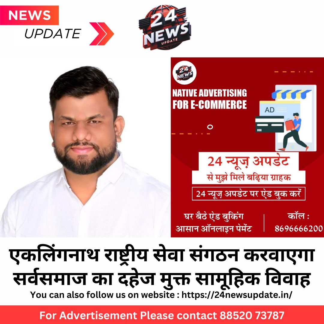 24 न्यूज़ अपडेट उदयपूर। जय एकलिंगनाथ राष्ट्रीय सेवा संगठन की ओर से अक्षय तृतीया के अवसर पर सर्व समाज के निर्ध्रन व जरुरतमंद जोडो का सामूहिक विवाह करवाया जाएगा। इसके लिए 11 जोडो का रजिस्टेशन हो चुका है ओर यह प्रक्रिया अभी जारी है। यह सामूहिक विवाह भी दहेज मुक्त होगा और जोडे आठवें वचन के रुप में बेटी बचाओ-बेटी पढाओ का संकल्प लेंगे।