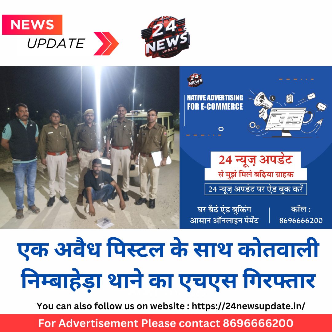 24 न्यूज़ अपडेट निम्बाहेडा । कोतवाली निम्बाहेड़ा थाना पुलिस ने शहर के कच्ची बस्ती रिको एरिया से एक व्यक्ति के कब्जे से एक अवैध पिस्टल जब्त कर आरोपी को गिरफ्तार किया है। गिरफ्तार आरोपी कोतवाली निम्बाहेड़ा थाने का एचएस होकर एक दर्जन के करीब मामलों में लिप्त हैं।