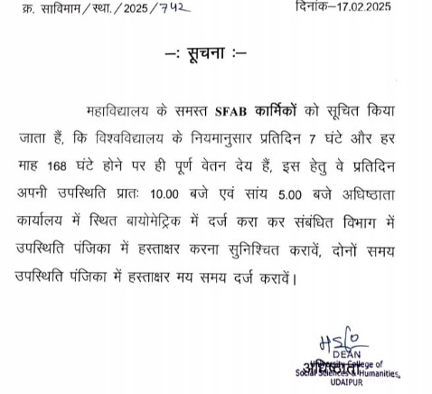 24 न्यूज अपडेट. उदयपुर। मोहनलाल सुखाड़िया विश्वविद्यालय उदयपुर में राजस्थान सरकार की ओर से जारी 1 जनवरी 2025 से 31 दिसंबर तक 1 साल का कार्यकाल बढ़ा दिया। उसका आदेश भी आ गया लेकिन आज तक उसकी पालना भी नहीं हुई और ना एक साल का ऑर्डर प्रशाशन ने एसएफएबी कर्मचारियों का जारी किया। दिसंबर माह में कार्यकाल खत्म हो गया तब सभी कर्मचारियों को हड़ताल एवं आंदोलन का सहारा लेना पड़ा। इस दौरान सभी छात्रों ओर स्थाई ओर अस्थाई सभी ने पूरा विश्वविद्यालय बंद करवाया सभी राजनीतिक लोगों ने भी सहयोग किया। तब सरकार को भी सहयोग करना पड़ा और सभी के सहयोग से एक साल का ऑर्डर सरकार को जारी करना पड़ा। अब बताया जा रहा है कि सरकार के आदेश की भी अवहेलना की जा रही हे इस कारण से एसएफएबी कर्मचारियों को जनवरी माह की भी सेलरी नहीं मिली और फरवरी भी खत्म होने आया है। इन कर्मचारियों की अब कौन सुनें, ना ही ऑर्डर ना ही तनख्वाह। प्रशासनिक स्वीकृति जारी हुई और ना ही वित्तीय स्वीकृति। इस बीच आज एक और ऑर्डर जारी हुआ उसमें सभी कर्मचारियों को 10 से 5 समय पर आना 168 घंटे महीने के होना और नहीं होने पर सेलरी काटना का फरमान है। सिर्फ काम करो समय पर सेलरी नहीं देना का यह फार्मूला होने पर विरोध हो रहा हैं जबकि स्थाई कर्मचारियों का समय 10. 30 से 5 बजे तक का है है। इससे पहले दस प्रतिशत प्रति वर्ष सैलरी बढ़ती थी वह भी नहीं बढ रही है दो साल से। ऐेसे में कम वेतन पर काम कर रहे कर्मचारियों को आर्थिक नुकसान भी उठाना पड़ रहा हैं। ऐसे में कर्मचारियों को भारी परेशानी हो रही है। पिछले पूरे साल में तीन बार आंदोलन किया गया व हड़ताल हुई। राज्य सरकार ने तो सुन ली और एक वर्ष का ऑर्डर जारी कर दिया लेकिन मोहनलाल सुखाड़िया विश्विद्यालय प्रशासन अब तक चक्की पिसिंग एटीट्यूड पर अडा हुआ हैं।