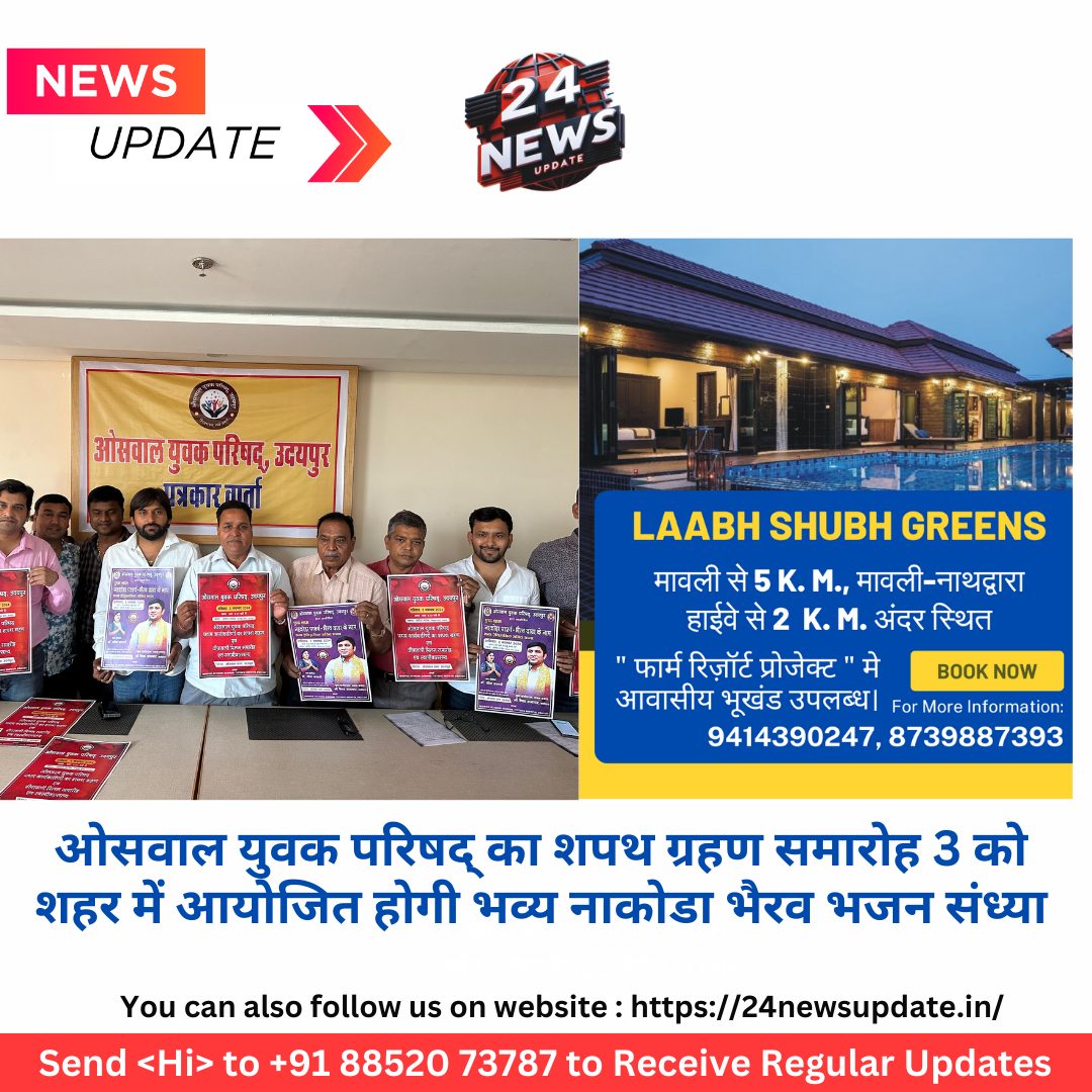 उदयपुर 28 अक्टूबर। शहर के प्रमुख सामाजिक संगठन ओसवाल युवक परिषद् के नवनियुक्त कार्यकारिणी का प्रथम शपथ ग्रहण समारोह और एक शाम नाकोडा पार्श्व भैरव दादा के नाम भव्य ऐतिहासिक भक्ति संध्या का आयोजन 2 और 3 नवम्बर को ओपेरा गार्डन में आयोजित किया जाएगा। परिषद् के अध्यक्ष अनिल जारोली ने बताया कि ओसवाल युवक परिषद् जैन समाज के युवकों का अग्रिम संगठन है ,शहर के युवा वर्ग के सभी प्रबुद्धजन इससे जुड़े है। इसी नवनियुक्त कार्यकारिणी द्वारा दो दिवसीय कार्यकमों का आयोजन किया जा रहा है। 2 नवम्बर शाम को आयोजित कार्यकम के प्रथम दिन भव्य पार्श्व नाकोडा भैरव भक्ति संध्या और दीपावली स्नेह मिलन का आयोजन किया जाएगा,जिसमें युवा संगीतरत्न भजन सम्राट वैभव बागमार और स्वर कोकिला डॉ सीमा दफ्तरी के सुरों द्वारा भव्य भक्ति संध्या आयोजित होगी। कार्यकम में प्रवेश निःशुल्क रहेगा। 3 नवम्बर ओसवाल युवक परिषद् के कार्यकारिणी का प्रथम शपथ ग्रहण समारोह का आयोजन होगा। कार्यकम के मुख्य अतिथि पंजाब के राज्यपाल गुलाब चन्द कटारिया और राज्यमंत्री राजस्थान गौतम दक होंगे। परिषद् के महामंत्री धीरज भाणावत ने बताया कि परिषद् के आगामी कार्यकमों के तहत ओसवाल क्रिकेट प्रीमियर लीग ओर रक्त दान महादान कार्यक्रम का आयोजन होगा। ओसवाल सभा के अध्यक्ष प्रकाश कोठारी ने बताया कि ओसवाल सभा द्वारा गत वर्ष की तरह इस वर्ष भी संपूर्ण ओसवाल छोटे साजन समाज का स्नेह मिलन कार्यकम आयोजित होगा। गत एक वर्ष में ओसवाल सभा द्वारा समाज को आर्थिक सुदृढ़ता प्रदान करने के लिए आय में चार गुना वृद्धि,ओसवाल स्पोर्ट्स टूर्नामेंट का आयोजन, वृहद स्तर पर ओसवाल वन भ्रमण कार्यक्रम (मल्हार), समाज की समस्त गतिविधियों की जानकारी हेतु ओसवाल संदेश का प्रकाश निरंतर जारी है। सचिव आनंदीलाल बंबोरिया ने बताया कि युवक परिषद् का गठन इसी उद्देश्य से किया गया है कि समाज में युवाओं की भागीदारी बढ़ाने के उद्देश्य से किया गया है। सहसचिव मनीष नागौरी ने बताया कि युवक परिषद् महिला प्रकोष्ठ,बहु प्रकोष्ठ का भी गठन किया गया है। समाज की डिजीटल एप वेबसाइड का लांच किया जाएगा। इस दौरान प्रचार प्रसार मंत्री रोहित कोठारी,पंकज मेहता,दिलीप कोठारी,विजय दलाल,लवेश भंडारी,शौकीन पितलिया,अभिषेक मोगरा,शुभम जारोली,वैभव जारोली सहित कही पदाधिकारी मौजूद थे। Share this: Share on X (Opens in new window) X Share on Facebook (Opens in new window) Facebook More Email a link to a friend (Opens in new window) Email Share on WhatsApp (Opens in new window) WhatsApp Like this:Like Loading... Related Discover more from 24 News Update Subscribe to get the latest posts sent to your email. Type your email… Subscribe Post navigation व्यापारी की हत्या के बाद आक्रोश, शव के साथ सड़क पर किया प्रदर्शन पुलिस के प्रति जबर्दस्त गुस्सा सविना पुलिस की गिरफ्त में आए 2 शातिर चेन स्नैचर