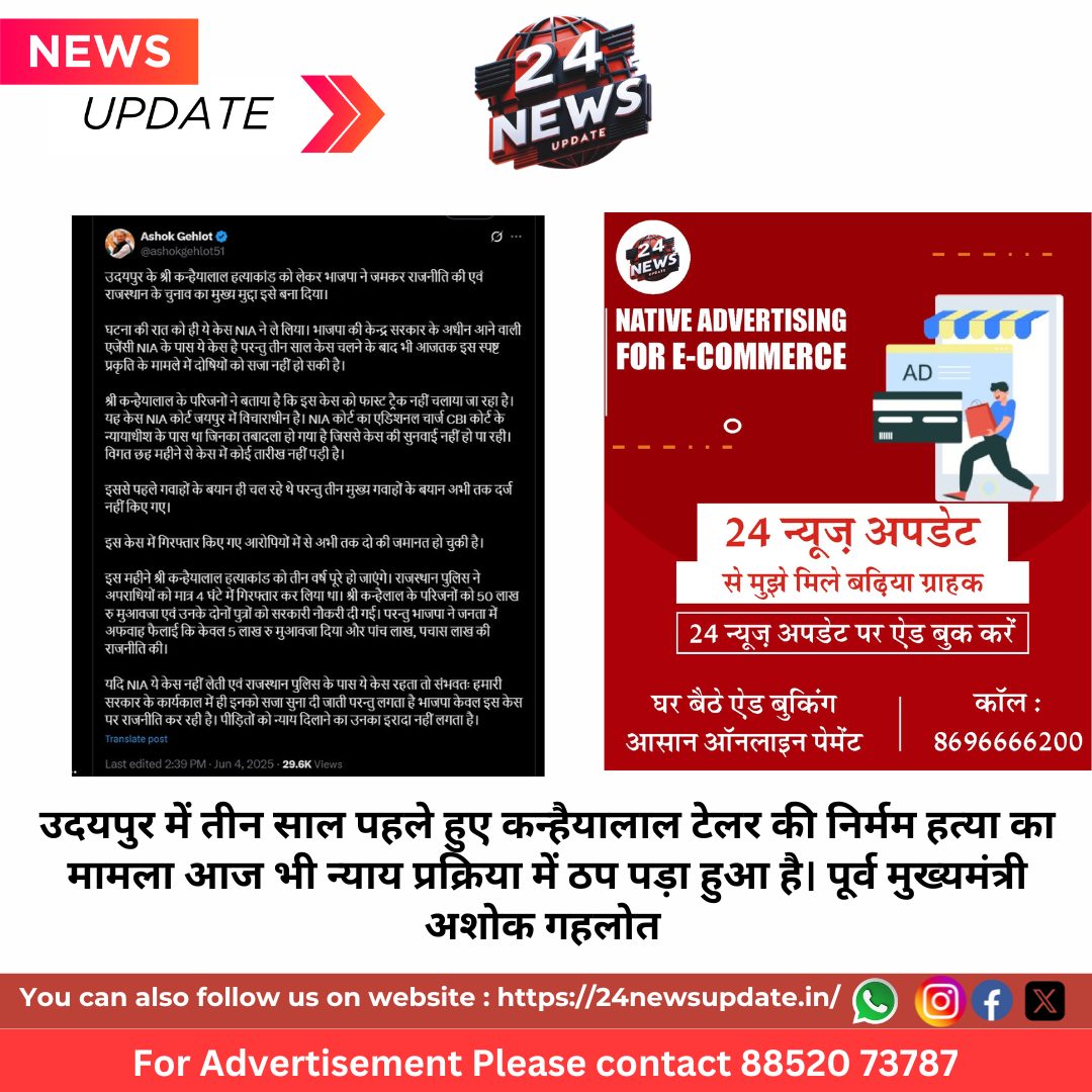 24 न्यूज अपडेट, उदयपुर। उदयपुर में तीन साल पहले हुए कन्हैयालाल टेलर की निर्मम हत्या का मामला आज भी न्याय प्रक्रिया में ठप पड़ा हुआ है। पूर्व मुख्यमंत्री अशोक गहलोत ने इस बात पर गहरा ऐतराज जताते हुए कहा है कि केंद्रीय जांच एजेंसी एनआईए के पास केस होने के बावजूद पिछले छह महीने से सुनवाई तक नहीं हो पाई है। उन्होंने बताया कि केस के तीन मुख्य गवाहों के बयान अभी तक दर्ज नहीं हुए हैं, जबकि राजस्थान पुलिस ने घटना के मात्र चार घंटे के भीतर मुख्य आरोपियों को गिरफ्तार कर लिया था। गहलोत का यह भी कहना है कि यदि यह मामला एनआईए के बजाय राजस्थान पुलिस के पास रहता, तो दोषियों को पहले ही सजा मिल चुकी होती। इसके बावजूद, भाजपा ने इस संवेदनशील मामले को चुनावी राजनीति का विषय बनाकर जनता में गलतफहमी और अफवाहें फैलाई हैं। उन्होंने स्पष्ट किया कि कन्हैयालाल के परिवार को 50 लाख रुपए का मुआवजा और उनके दोनों पुत्रों को सरकारी नौकरी दी गई है, लेकिन भाजपा ने इस तथ्य को छुपाकर केवल 5 लाख रुपए मुआवजे की राजनीति की है।