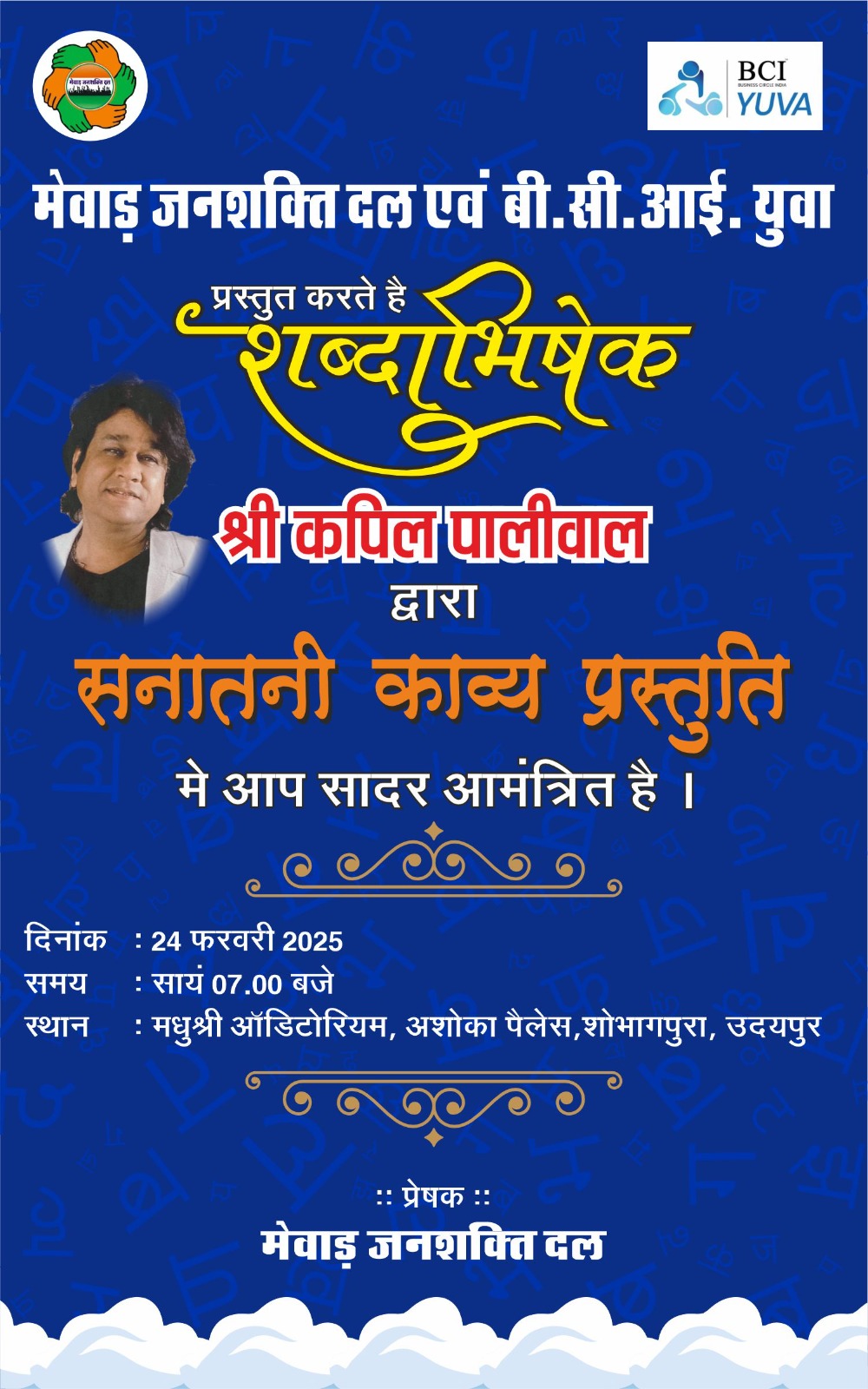 24 न्यूज़ अपडेट उदयपुर. मेवाड़ जनशक्ति दल उदयपुर एवं बिजनेस सर्कल इंडिया (BCI) के सौजन्य से मधुश्री ऑडिटोरियम शोभागपुरा रोड पर एक अद्वितीय काव्य प्रस्तुति “शब्दाभिषेक” का आयोजन किया जाएगा।