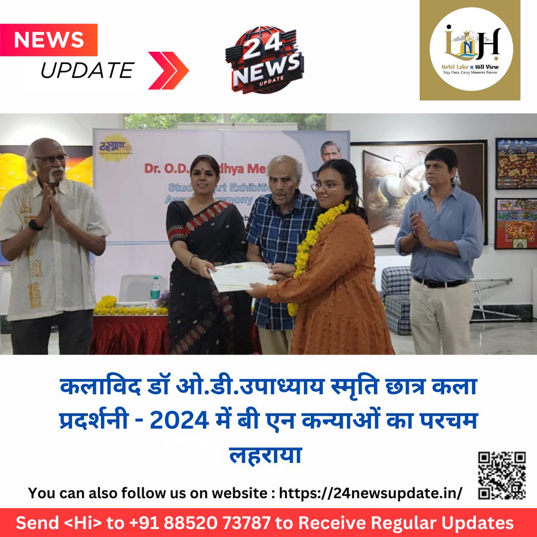 24 न्यूज़ अपडेट उदयपुर. 3 सितम्बर : भूपाल नोबल्स कन्या महाविद्यालय की अधिष्ठाता डॉ शिल्पा राठौड़ ने बताया कि कन्या महाविद्यालय के चित्रकला विभाग की छात्राओ ने कला के क्षेत्र में उपलब्धि हासिल कर महाविद्यालय का नाम रोशन किया है। कलाविद डॉ ओ.डी.उपाध्याय स्मृति छात्र कला प्रदर्शनी – 2024, टखमण -28 कला केंद्र, उदयपुर द्वारा आयोजित कला प्रदर्शनी में बीएन पीजी गर्ल्स कॉलेज की चित्रकला विभाग की तृतीय वर्ष की छात्रा ख़शुबू खींची को डॉ.ओ.डी.उपाध्याय अवार्ड से नवाजा गया तथा बीए द्वितीय सेमेस्टर की साइमा खानम को डॉ आर.के.वशिष्ठ अवार्ड से नवाज़ा गया एवं दोनों विजेताओं को पाँच-पाँच हज़ार की राशि पुरस्कार स्वरूप प्रदान कर सम्मानित किया गया। एम.ए.द्वितीय समेस्टर की छात्रा हेमलता शर्मा और निशिता पालीवाल की कृतियों का भी चयन कर उसे प्रदर्शित किया गया। डॉ कंचन राठौड़ एवं डॉ भावना झाला ने बताया कि 100 पेंटिंग्स में से इन का चयन हुआ है यह पुरस्कार उदयपुर की कमिश्नर ने प्रदान किया।