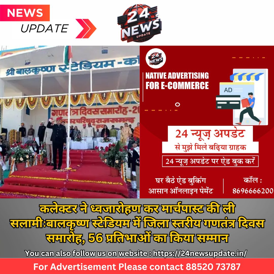 24 न्यूज अपडेट. राजसमंद। राजसमंद में 76वें गणतंत्र दिवस पर आज जिला स्तरीय समारोह बालकृष्ण स्टेडियम में कलेक्टर बालमुकुंद असावा ने ध्वजारोहण कर परेड का निरीक्षण किया। पुलिस, होमगार्ड व एनसीसी कैडेट्स ने परेड की सलामी भी ली। इसके बाद स्कूली बच्चों द्वारा देश भक्ति से ओतप्रोत प्रस्तुतियांं से देशभक्ति का जज्बा जगाया। अन्य व्यायाम प्रदर्शनों में भी खूब उत्साह दिखया। जिले में उत्कृष्ट कार्य करने पर प्रतिभाओं का सम्मान किया किया गया। कुल 56 प्रतिभाओं का सम्मान किया जाएगा। प्रशासन, शिक्षा, चिकित्सा, सामाजिक सेवा, सूचना प्रौद्योगिकी सहित विभिन्न विभागों में उल्लेखनीय योगदान देने वाले व्यक्तियों को प्रशस्ति पत्र एवं सम्मान प्रदान किया गया।इनका हुआ सम्मानडॉ. सुमन अजमेरा, डीपीएम, राजीविका, राजसमंद, उमेश रायका, श्रम कल्याण अधिकारी, प्रवेश परदेशी, जिला सूचना एवं जनसंपर्क अधिकारी, हनुवीर सिंह, विकास अधिकारी, पंचायत समिति खमनोर तथा मनीष जैन, सिस्टम ऑफिसर, जिला एवं सेशन न्यायालय, शामिल हैं। इनके साथ ही डॉ. अपर्णा शर्मा, प्राचार्य, बीएन पीजी गर्ल्स कॉलेज कांकरोली, शंकरलाल माली, सहायक परियोजना अधिकारी, जिला साक्षरता एवं सतत शिक्षा, डॉ. पीसी रेगर, वरिष्ठ वैज्ञानिक एवं अध्यक्ष, कृषि विज्ञान केन्द्र राजसमंद और वेलचन्द डाबी, सीनियर नर्सिंग ऑफिसर, जिला चिकित्सालय राजसमंद को भी सम्मानित किया गया। शिक्षा क्षेत्र में उत्कृष्ट सेवाओं के लिए शंकर सिंह खरवड़, प्रधानाध्यापक, राउप्रावि भगवान्दा खुर्द, यशवंत कुमार जोशी, उपप्राचार्य, सादड़ी, मोहन सिंह राठौड़, क्षेत्रीय प्रबंधक, एसबीआई, देवेन्द्रसिंह देवड़ा, कनिष्ठ विधि अधिकारी, कलेक्ट्रेट राजसमंद और जगदीश चन्द्र तेली, कनिष्ठ सहायक, कोष कार्यालय राजसमंद को सम्मान प्रदान किया जाएगा। इसके अतिरिक्त जीवन सिंह देवड़ा, वनपाल, सरिता राव, सूचना सहायक, सामाजिक न्याय एवं अधिकारिता विभाग, विद्या जीनगर, प्रोग्रामर, सूचना प्रौद्योगिकी एवं संचार विभाग और दीपक शर्मा, वरिष्ठ सहायक, साक्षरता प्रकोष्ठ को भी सम्मानित किया गया। स्वास्थ्य और समाजसेवा के क्षेत्र में उल्लेखनीय कार्य करने वाले रामेश्वर प्रसाद, परिचालक, राजस्थान राज्य पथ परिवहन निगम, भंवरलाल भाटी, प्रधानाध्यापक (बीएलओ), बोरज का खेड़ा, दीपशिखा पालीवाल, डाटा एंट्री ऑपरेटर, राजीविका, यादराम चौधरी, फार्मासिस्ट, जिला चिकित्सालय नाथद्वारा और नरेश कुमार मीणा, वरिष्ठ सहायक, जिला पुलिस अधीक्षक कार्यालय को सम्मानित किया गया। नगर परिषद और अन्य सरकारी सेवाओं में योगदान के लिए पंकज चांवरिया, कार्यवाहक जमादार, नगर परिषद राजसमंद, विनोद जावा, कार्यवाहक स्वास्थ्य निरीक्षक, अभिमन्यु उदावत, कनिष्ठ अभियंत