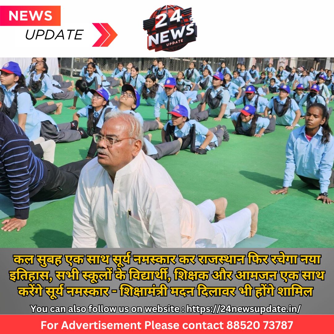 24 न्यूज अपडेट. जयपुर। राजस्थान में सोमवार को सूर्य सप्तमी के पूर्व दिवस पर एक बार फिर इतिहास रचा जाएगा। प्रदेशभर के राजकीय व निजी विद्यालयों में बच्चे, शिक्षक व आमजन एक साथ सूर्य नमस्कार कर भारतीय पारंपरिक योग प्रणाली द्वारा स्वस्थ जीवन जीने का संदेश देंगे। पिछले वर्ष राज्य में 1.33 करोड़ विद्यार्थियों ने एक साथ सूर्य नमस्कार कर विश्व रिकॉर्ड बनाया था। पिछले वर्ष के रिकॉर्ड को देखते हुए इस बार के आयोजन में और अधिक उत्साह देखने को मिलेगा। राज्य के सभी राजकीय एवं निजी विद्यालयों में प्रातः 9 बजे एक साथ सूर्य नमस्कार रखा गया है। शिक्षा एवं पंचायतीराज मंत्री श्री मदन दिलावर स्वयं एसएमएस स्टेडियम के फुटबॉल मैदान में आयोजित होने वाले कार्यक्रम में सूर्य नमस्कार करेंगे। शिक्षामंत्री ने सभी प्रदेशवासियों से सूर्य नमस्कार कार्यक्रम में बढ़-चढ़कर शामिल होने की अपील की है।