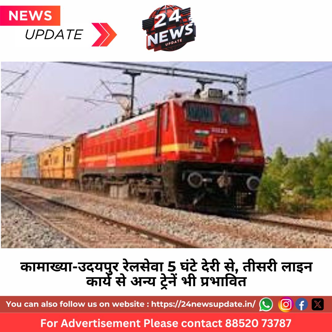 24 न्यूज अपडेट, उदयपुर: उदयपुर से होकर गुजरने वाली कामाख्या-उदयपुर सिटी रेलसेवा आगामी 1 मई को अपने निर्धारित समय से 5 घंटे की देरी से रवाना होगी। पूर्वोत्तर रेलवे के लखनऊ मंडल पर तीसरी रेलवे लाइन बिछाने के कार्य के चलते रेल यातायात प्रभावित रहेगा, जिसका असर कामाख्या-उदयपुर ट्रेन के साथ-साथ कुछ अन्य रेल सेवाओं पर भी पड़ेगा।