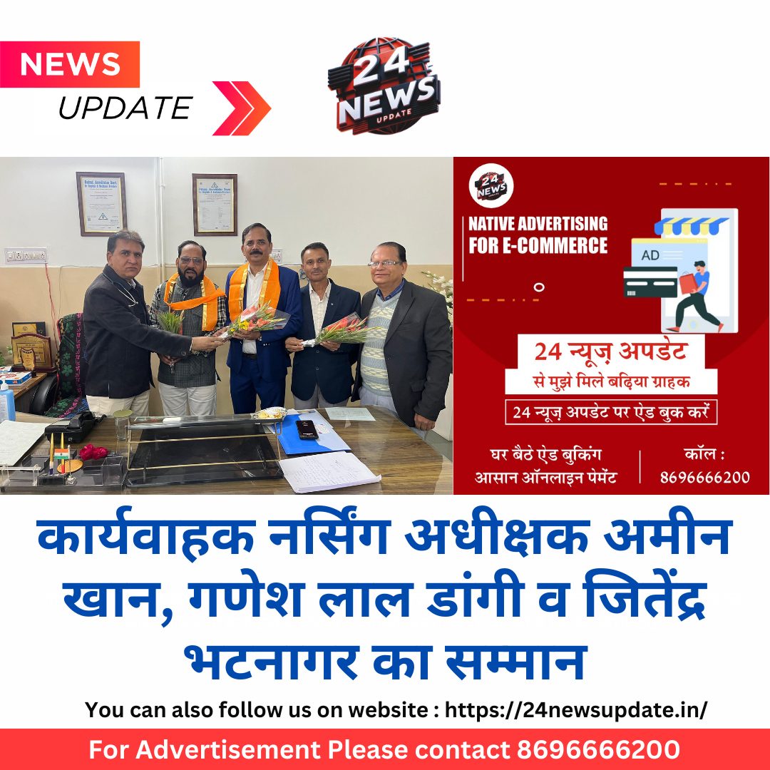 24 न्यूज अपडेट .उदयपुर। एमबी हॉस्पिटल उदयपुर के अधीक्षक डॉ आर एल सुमन द्वारा सीनियर नर्सिंग ऑफिसर अमीन खान, गणेश लाल डांगी एवं जितेंद्र भटनागर को कार्यवाहक नर्सिंग अधीक्षक बनाया है। अधीक्षक डॉ आर एल सुमन की उपस्थिति में कार्यवाहक नर्सिंग अधीक्षक अमीन खान ,गणेश लाल डांगी व जितेंद्र भटनागर को माला पहनकर, पुष्पगुच्छ भेंटकर स्वागत एवं अभिनंदन किया गया। राजस्थान नर्सिंग एसोसिएशन उदयपुर के संभागीय अध्यक्ष नरेश पूर्बिया ने बताया के कार्यक्रम में नर्सिंग अधीक्षक गीता आहारी, ओम प्रकाश पालीवाल व हसीना आहरी, प्रदेश कार्यकारी अध्यक्ष हेमंत आमेटा, जिला अध्यक्ष पवन कुमार दानाध्यक्ष, संभागीय अध्यक्ष नरेश पूर्बिया, नारायण सिंह,सकीला अंसारी, महेंद्र सिंह सारंगदेवोत ,ललित गंधर्व, जितेंद्र शर्मा,भीम सिंह, अनिल प्रजापत, हेमंत मीणा, सीमा चौधरी सहित कई सीनियर नर्सिंग ऑफिसर उपस्थित थे।